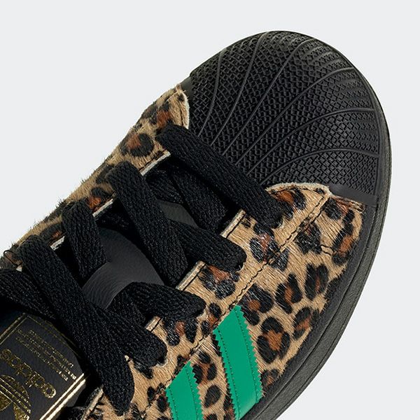 アニマル柄プリントのディテールと大胆な配色が、アイコニックなスタイルにエッジの効いたルックスをもたらし、一方で、独特のシェルトゥとギザギザのスリーストライプにより、オリジナルの雰囲気は健在。