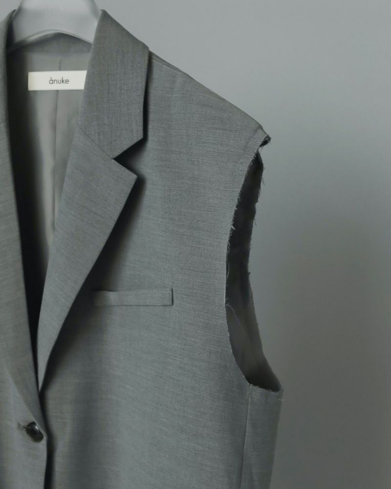 平織りのヘザー素材で仕上げたオーバーベスト。肩パットを入れたテーラードデザインでマニッシュに仕上げました。アームホールのカットオフデザインがポイントです。シンプルなワンピースやトップスの上に羽織るだけで、シックな装いに。同素材のアウターSoutiencollar Raglan CoatやPanel Wide Pantsとセットで着ていただくのもおすすめです。