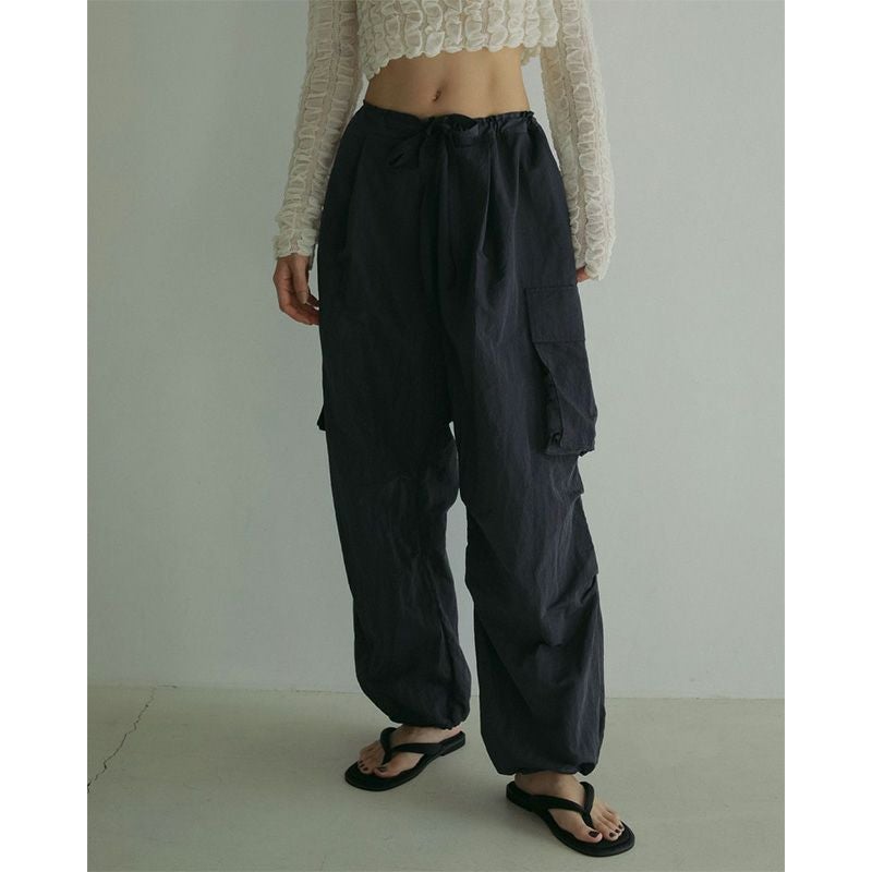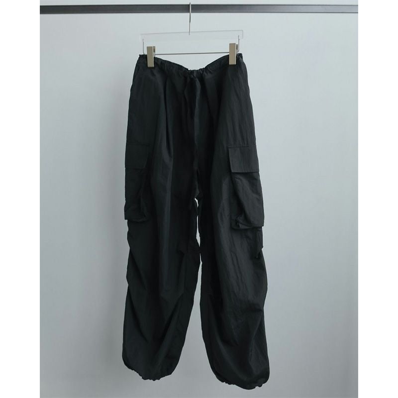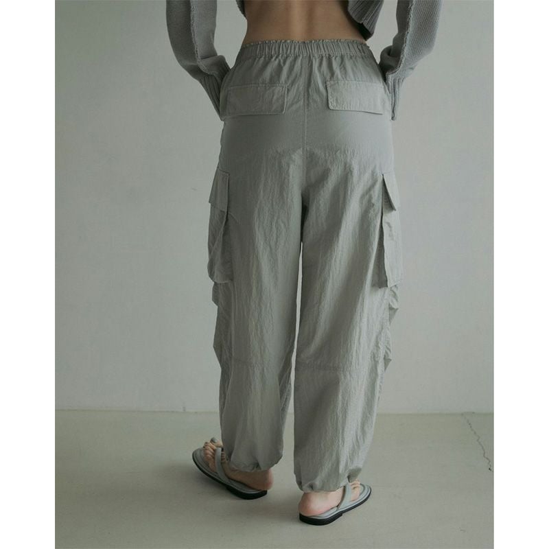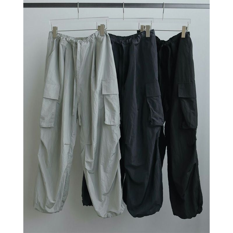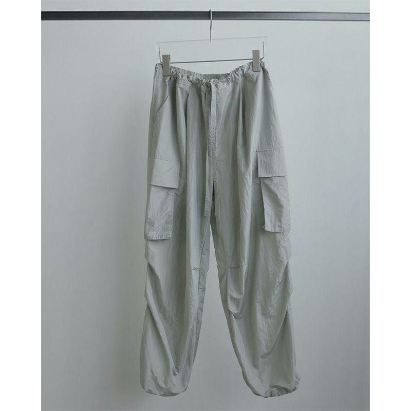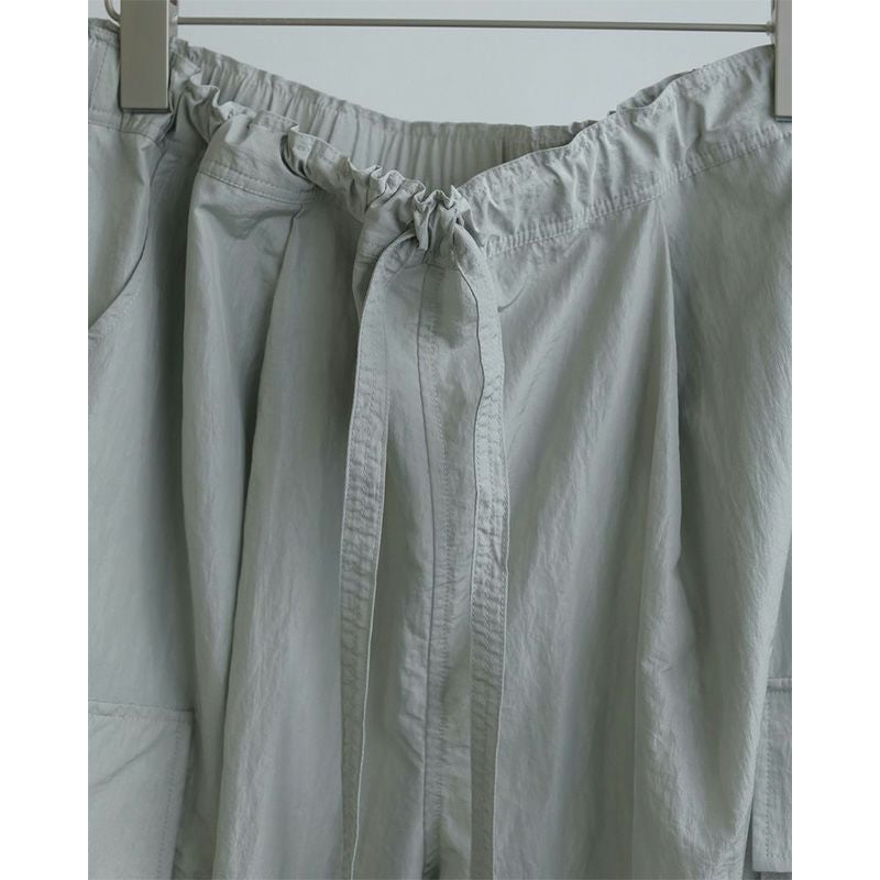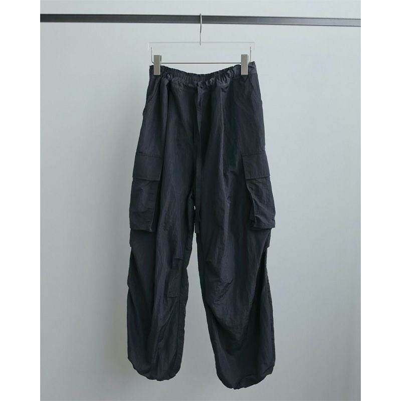 ナイロン素材で軽やかに仕上げたカーゴパンツ。程良い艶のある素材がカジュアルながら洗練された印象を演出してくれます。ウエストは共布紐でお好みのフィット感に調整可能です。裾にはゴムコード入りで、シルエットを自在にアレンジできるのもポイント。ラフにオーバーなシャツと合わせたボーイッシュなスタイリングから、ショートトップスやタンクトップと合わせたメリハリのあるモードなスタイリングが都会的な装いまでシフトできる、幅広い着こなしが楽しめる一本。デイリースタイルからアクティブなシーンまで、ワードローブに一枚あると頼れるアイテムです。