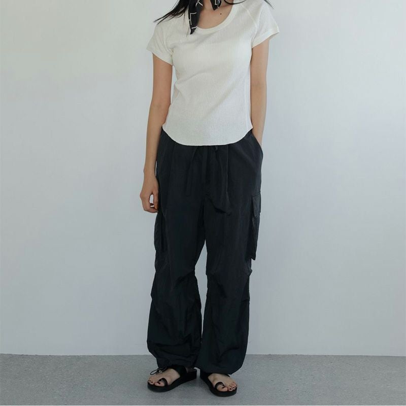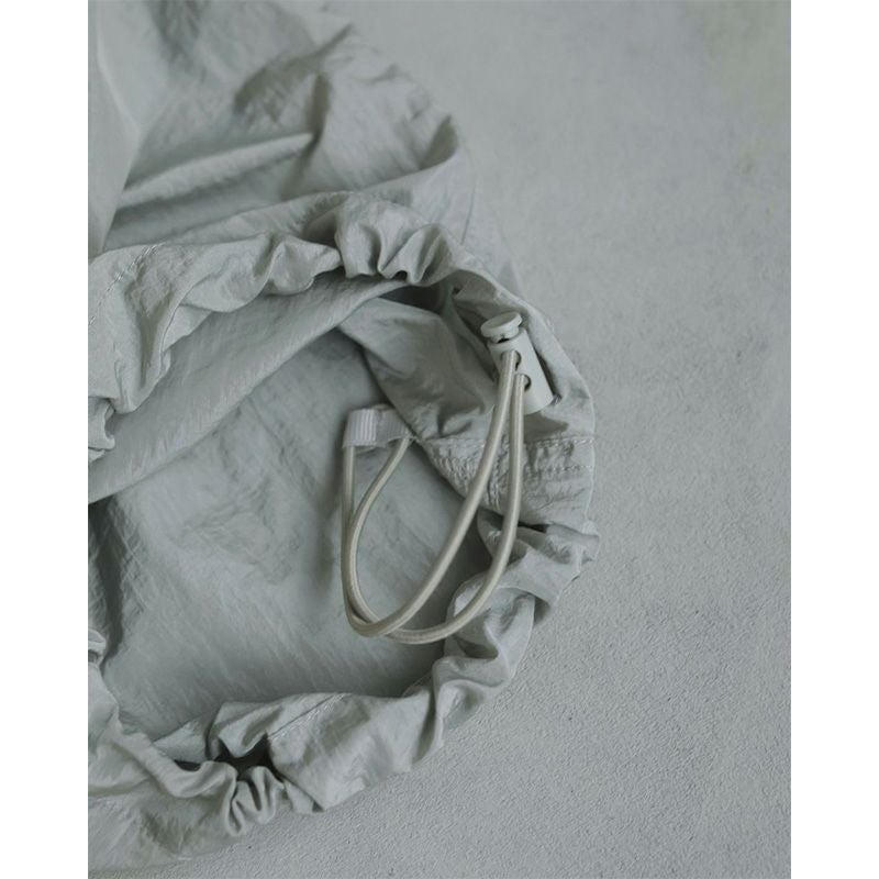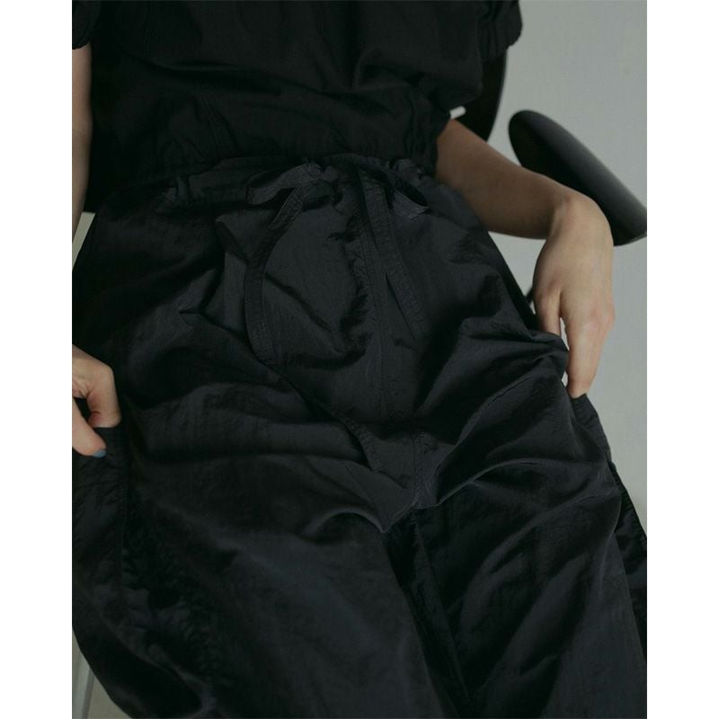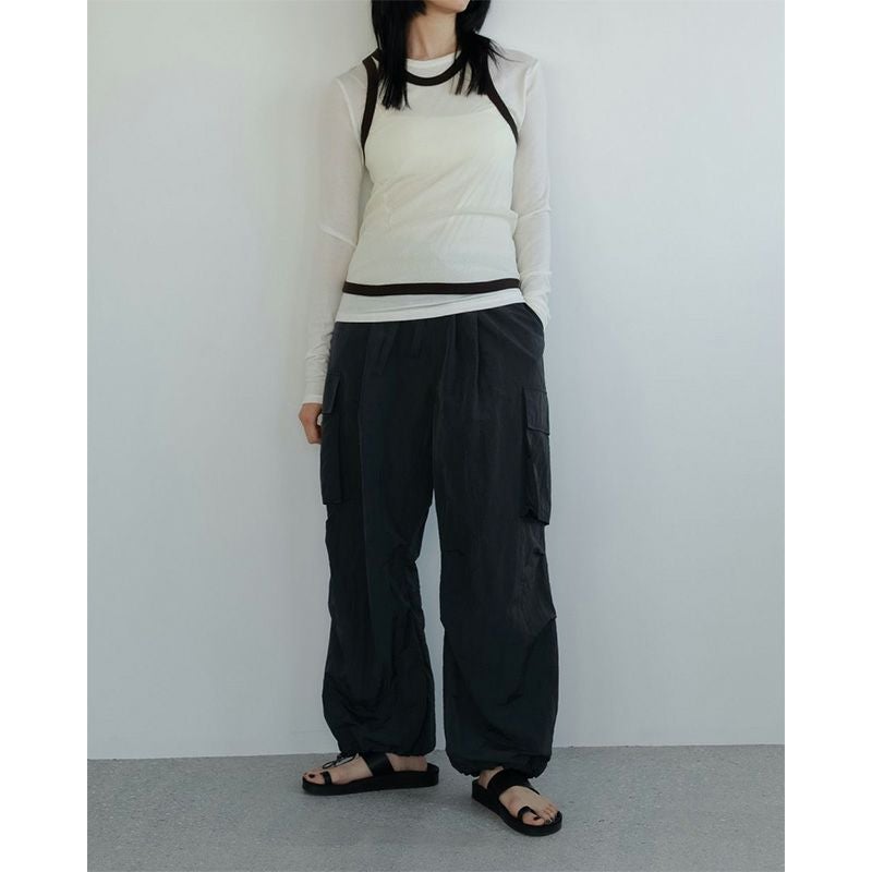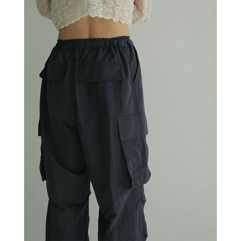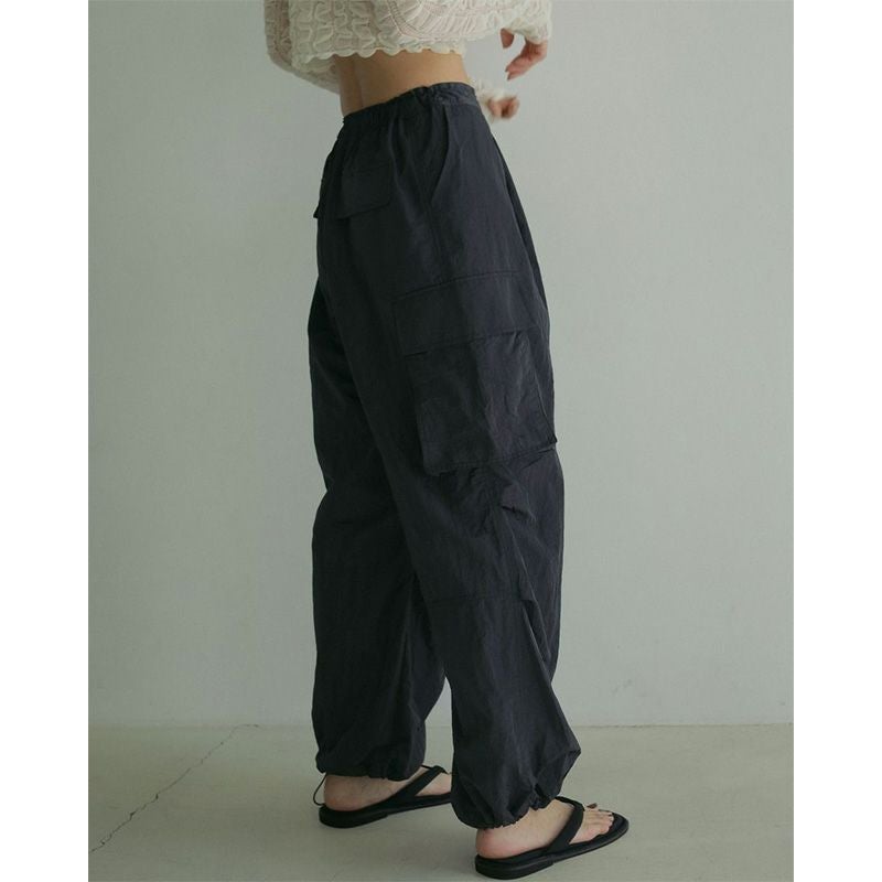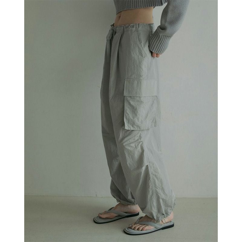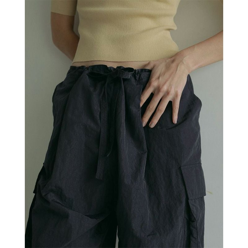 ナイロン素材で軽やかに仕上げたカーゴパンツ。程良い艶のある素材がカジュアルながら洗練された印象を演出してくれます。ウエストは共布紐でお好みのフィット感に調整可能です。裾にはゴムコード入りで、シルエットを自在にアレンジできるのもポイント。ラフにオーバーなシャツと合わせたボーイッシュなスタイリングから、ショートトップスやタンクトップと合わせたメリハリのあるモードなスタイリングが都会的な装いまでシフトできる、幅広い着こなしが楽しめる一本。デイリースタイルからアクティブなシーンまで、ワードローブに一枚あると頼れるアイテムです。