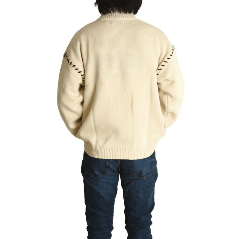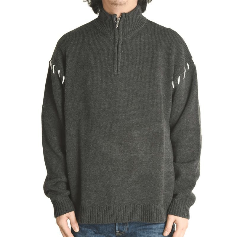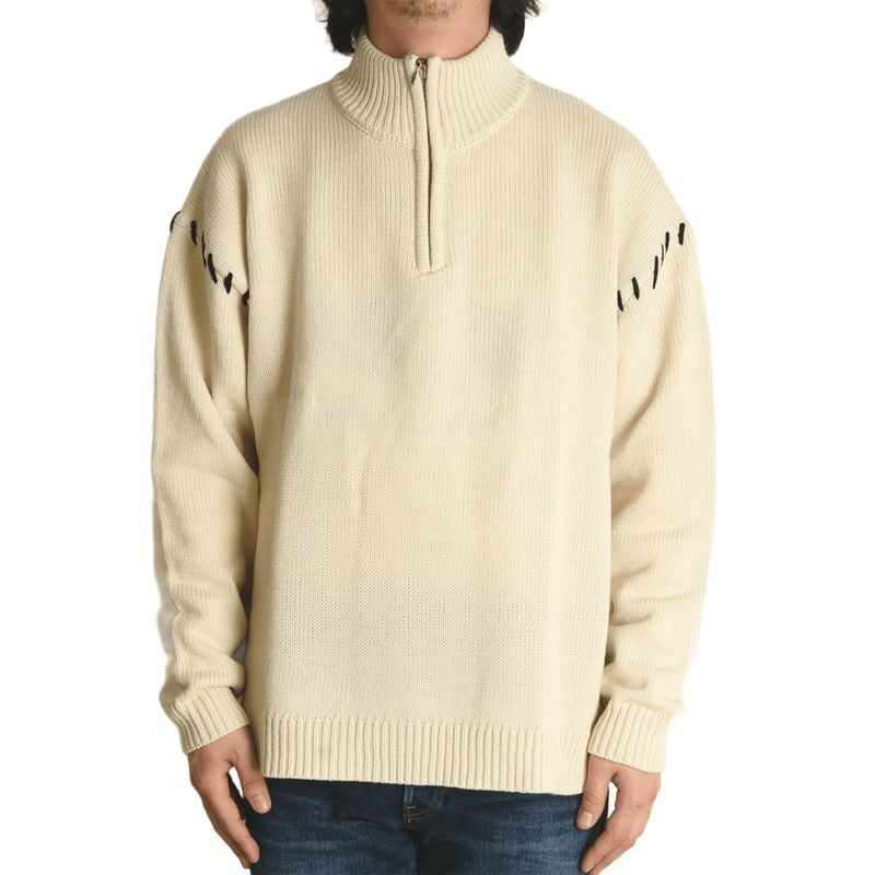 シンプルながら存在感のあるハンドステッチ風デザインが特徴のハーフジップニット。