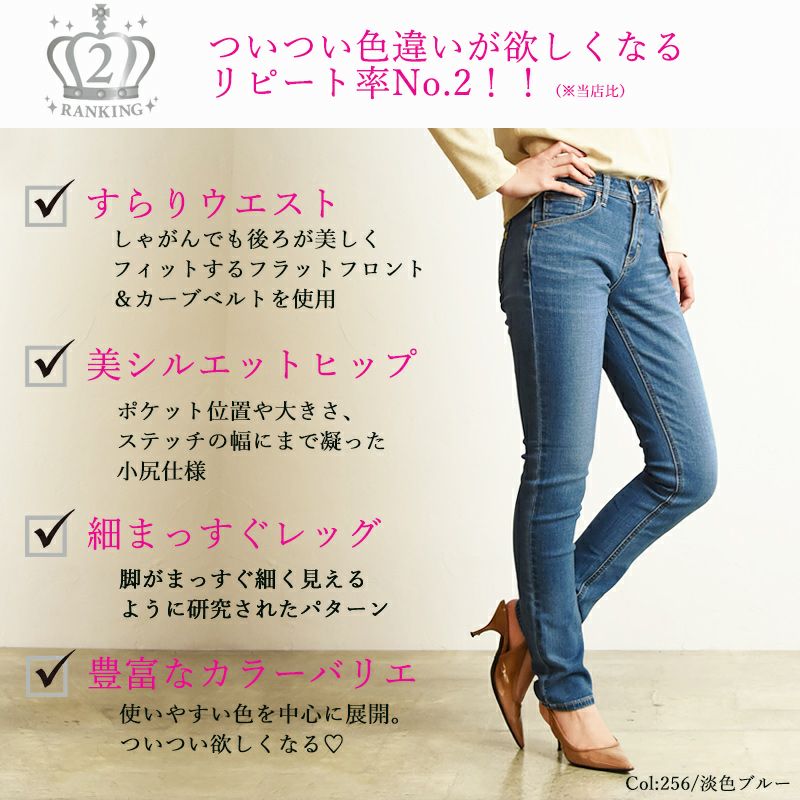 こちらは、脚長効果をもたらしてくれる定番スキニージーンズです。しゃがんでも美しくフィットするウエストライン、ポケットの大きさやステッチの幅にまでこだわった小尻仕様、足がまっすぐ見えるよう研究されたパターン設計で美脚演出にこだわったデニムパンツ。ベーシックな5ポケットでデイリーで気負いなく楽しめるのが魅力になっています。定番として押さえておきたいアイテムです。