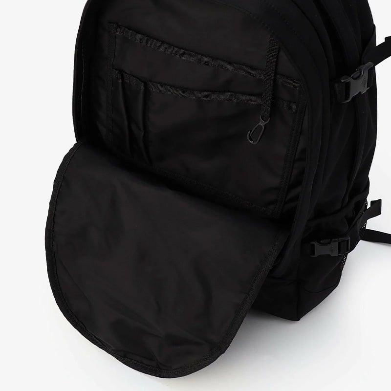 ・本体はダブルファスナー開閉仕様で、サイドポケットとコンプレッションストラップを装備。内部にベルクロ開閉のメッシュ背面ポケットを配備
