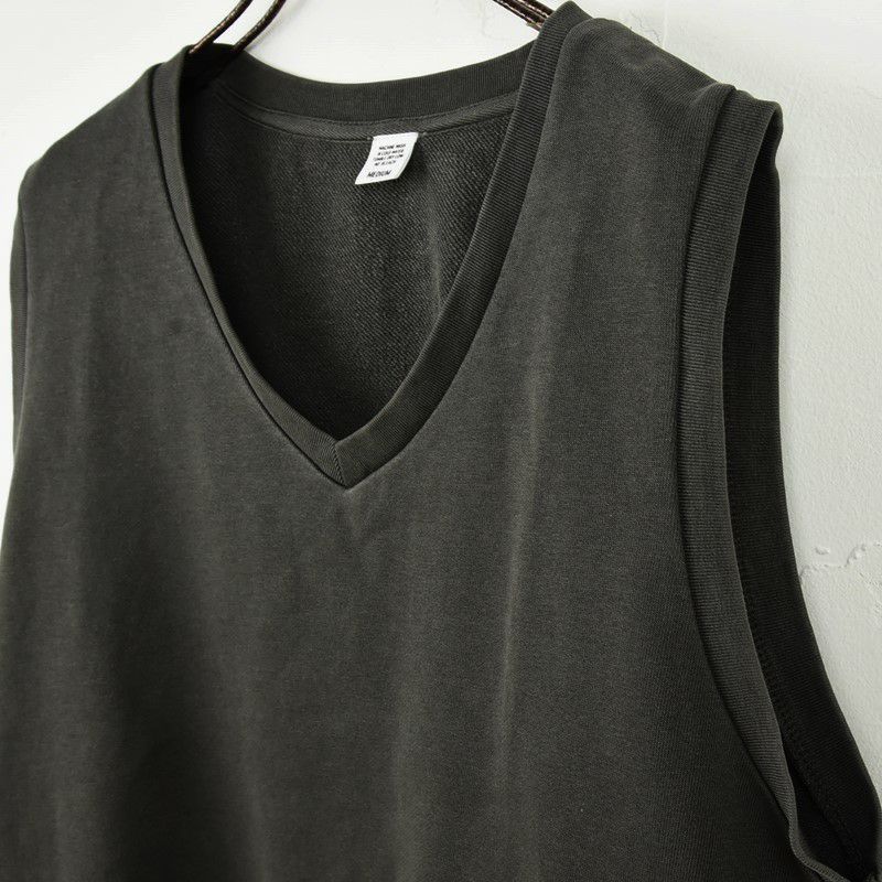 裏毛のスウェット生地を使用したVネックベスト。まだまだ半袖着たい!けど秋っぽくアレンジしたい!そんなにオススメです。夏のスタイリングにプラスアルフェするだけで秋スタイルにシフト。