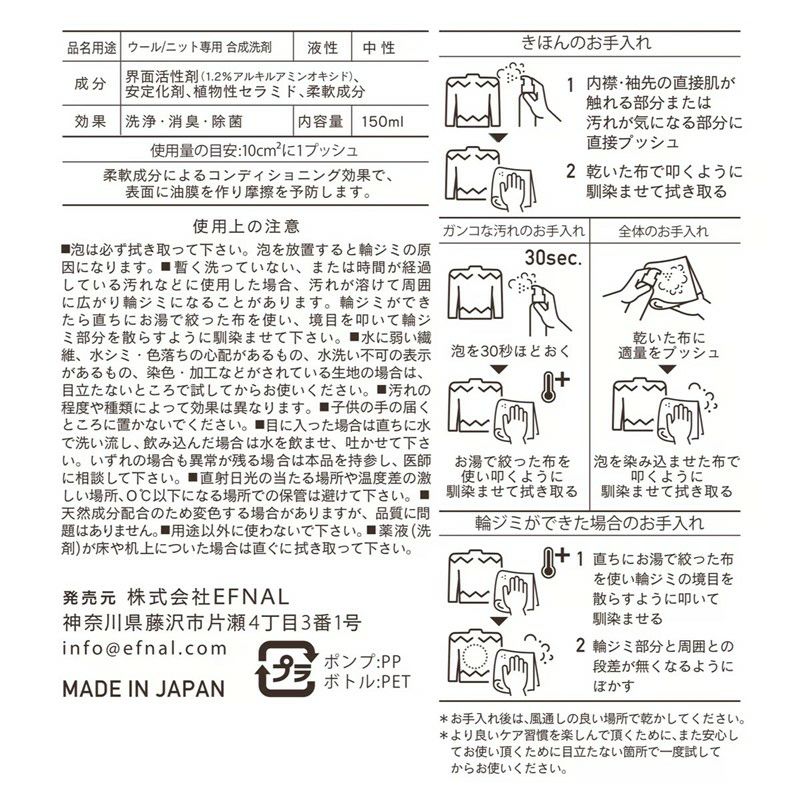 気軽に洗いにくいウールコートやニットなどを水を使わずに洗浄、消臭、除菌ができるウール・ニット専用洗剤です。