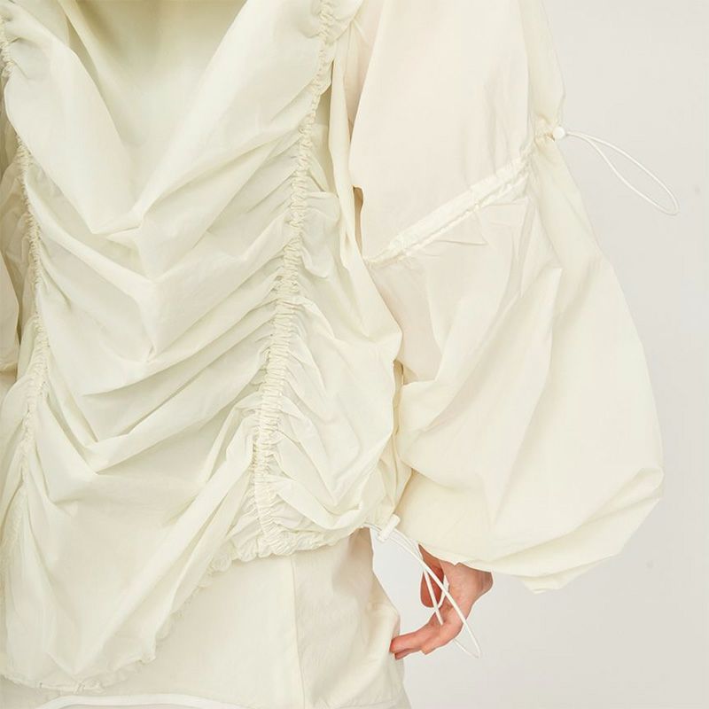 ほどよく透け感のある素材に身頃と袖のギャザーディテールがアクセントになりスポーティーすぎないクロップド丈のブルゾンです。