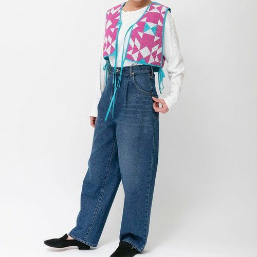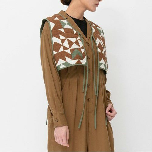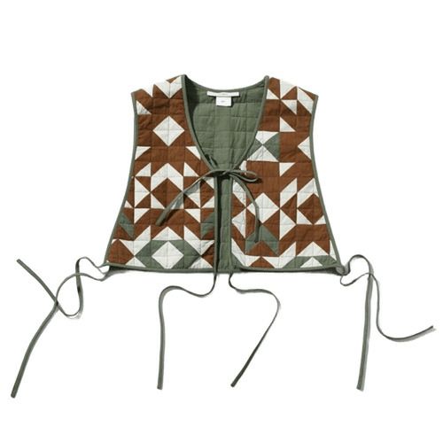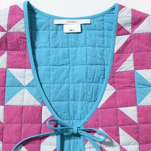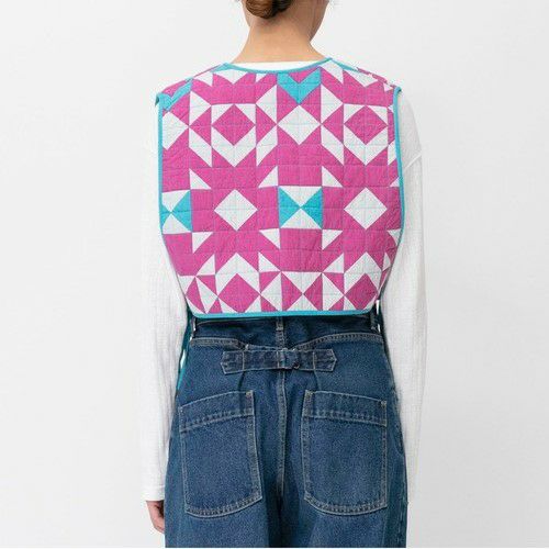 プリントにハンドステッチでキルトした中綿入りベスト。
