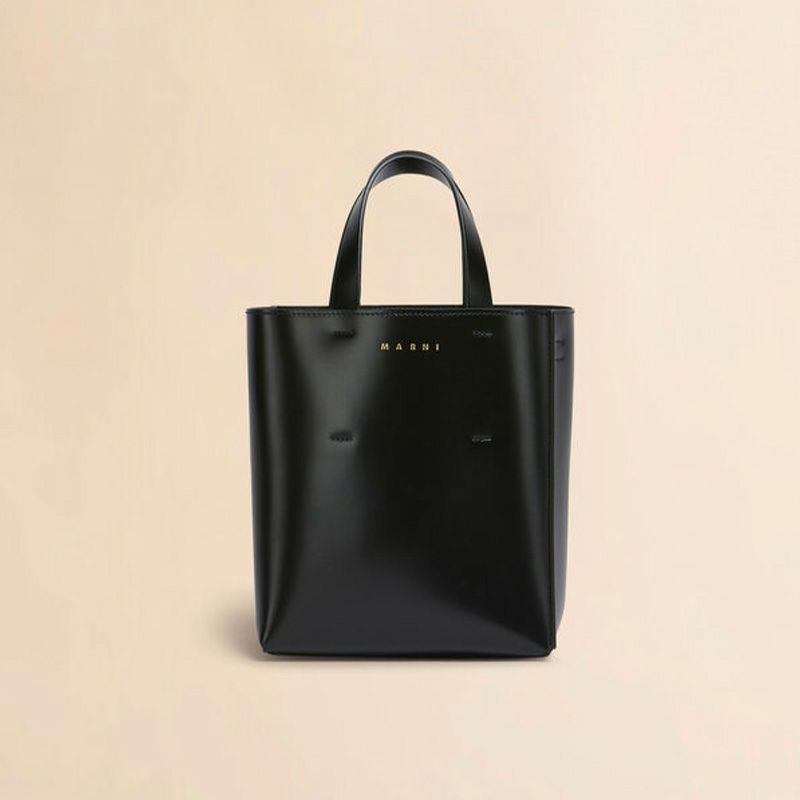 カーフレザー製 North/South トートバッグ、ミニサイズ、内側にスロットポケット付き。 内側に布製巾着ポーチ付き。 レザー製トップハンドル。 取り外し・調節可能なリサイクルテープ製ショルダーストラップにはマルニレター入り。 単色デザイン。 ゴールドトーンのメタルパーツ。 外側にゴールドのロゴプリント。