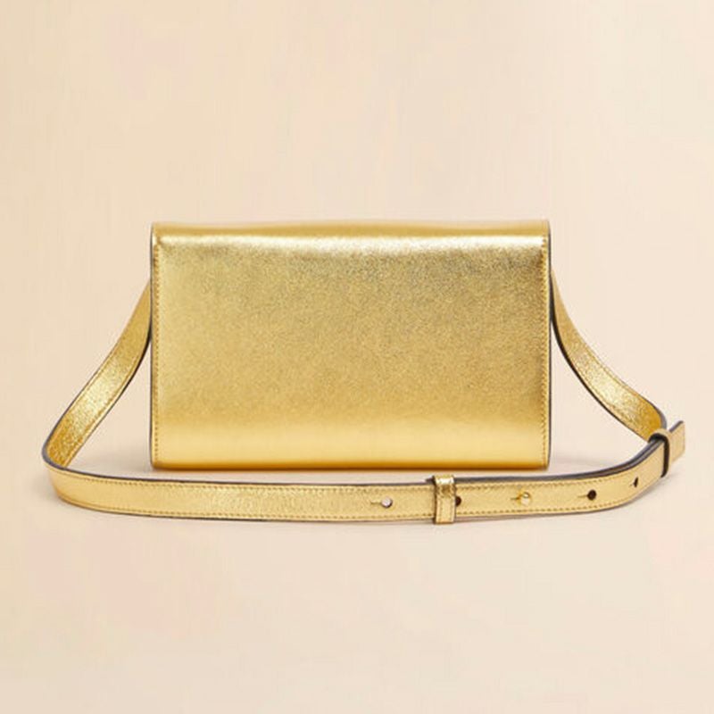 メタリックレザー製 Trunkaroo クラッチバッグ。 コンパクトなデザイン、調節・取り外し可能なスライド式ストラップ付き。 スカルプトデザインのフロントフラップには、2つの特徴的なメタルスタッズのディテール付き。 ビスコースのライニング、内側にカードスロット2つ。 ゴールドトーンのメタルパーツ。