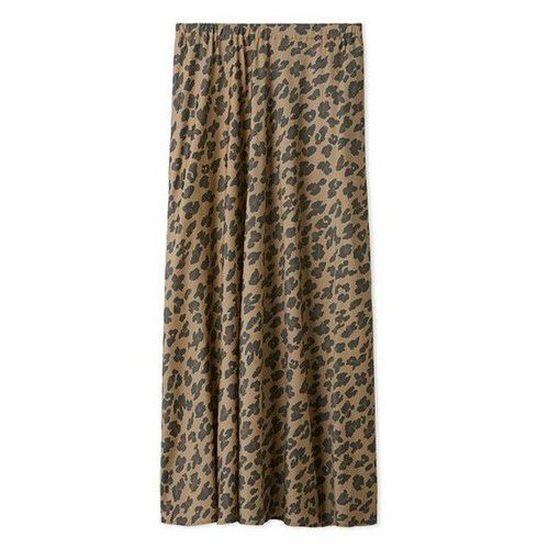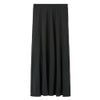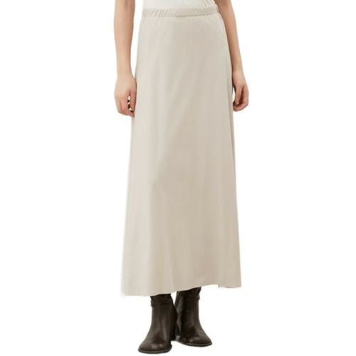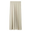 ウエストから裾にかけて、ストンと落ちるようなナローなシルエットですが、生地を贅沢にバイアス使いすることで、美しいフレア感が出るように工夫しています。きれいめに見えるのに、ウエストはゴムの仕様なので、気負わず使えて楽に脱ぎ着できるのもうれしいポイントです。