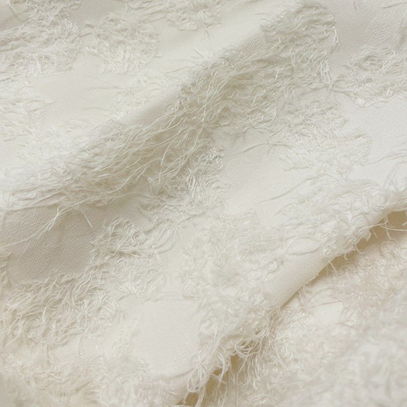 表情豊かなジャガードがユニークなフレアスカート。表面に凹凸のある毛足の長いジャガードは存在感があるため、ボリュームを持たせながらも、腰まわりからミドルヒップラインはすっきりと。女性らしいシルエットに仕上がっています。