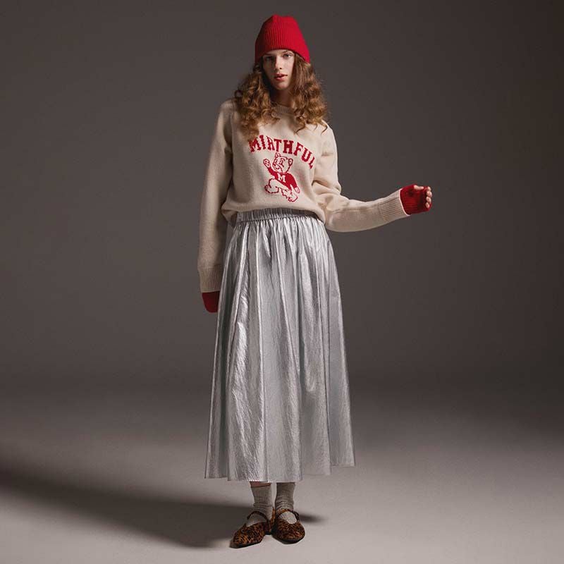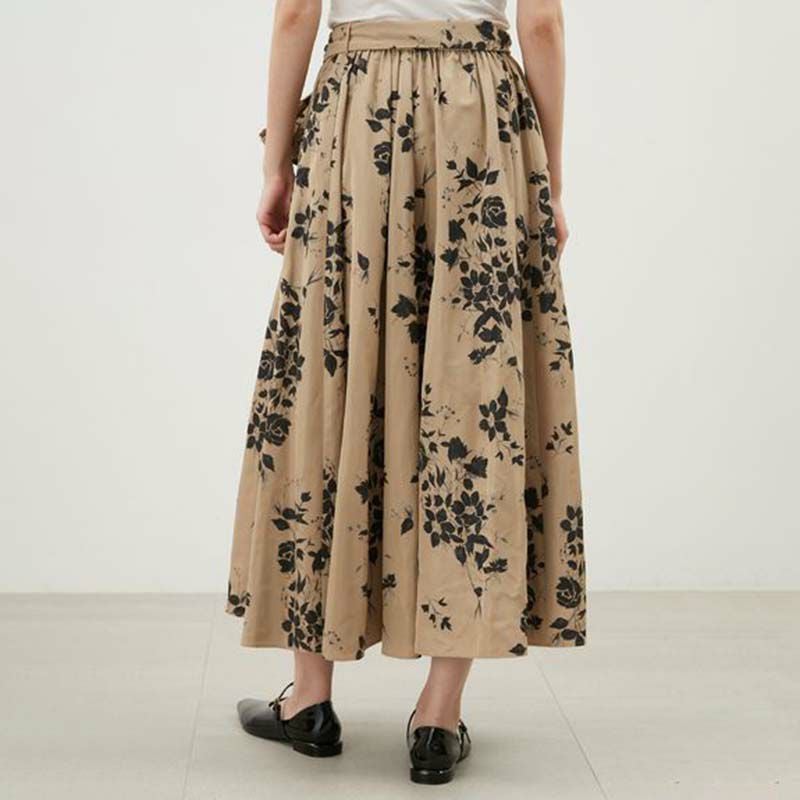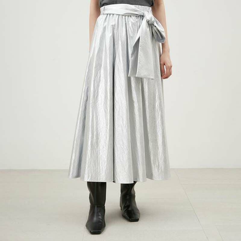 ウエストに入ったタック&ギャザーで、裾に向かって広がるフレアラインが華やかな印象に。素材のハリ感と分量のおかげで、ボディの輪郭を拾わず、きれいなシルエットがキープできます。