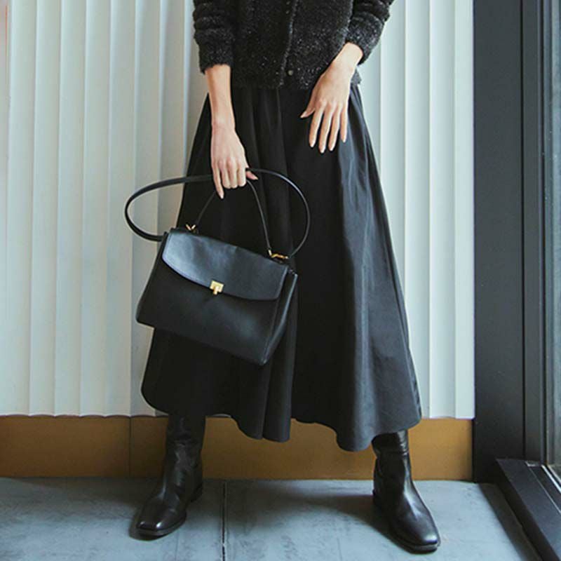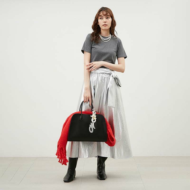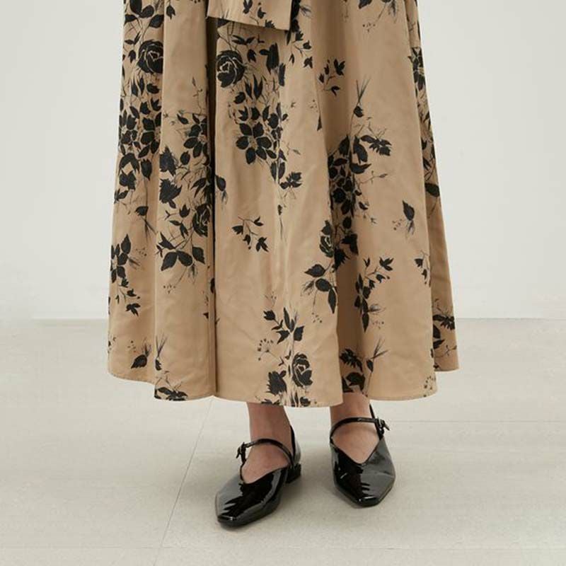 使用しているメモリー素材は、高密度で織り上げた独特の質感とハリ、光沢を持つ生地です。パリッとした感触で、ギャザーなどの立体的なデザインが映える質感です。カラーは3色で展開。光沢がドレッシーでイベントにも映える<ブラック>、モードな印象ですがデイリーにこそ活躍する<シルバー>、キャメルカラーに黒のボタニカル柄がハイブランド風の<フラワー>があります。