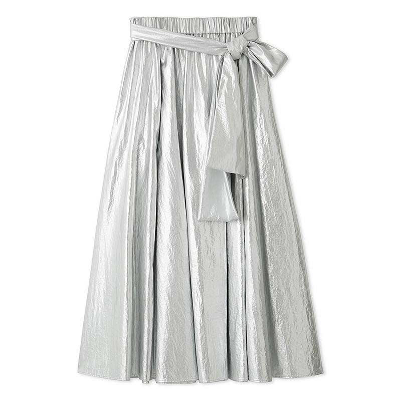 高密度でハリがあるメモリー素材で仕立てた、豪華なフレアスカートです。リッチでたっぷりしたリボンベルトがついているので、さらにレディーライクに装えます。
