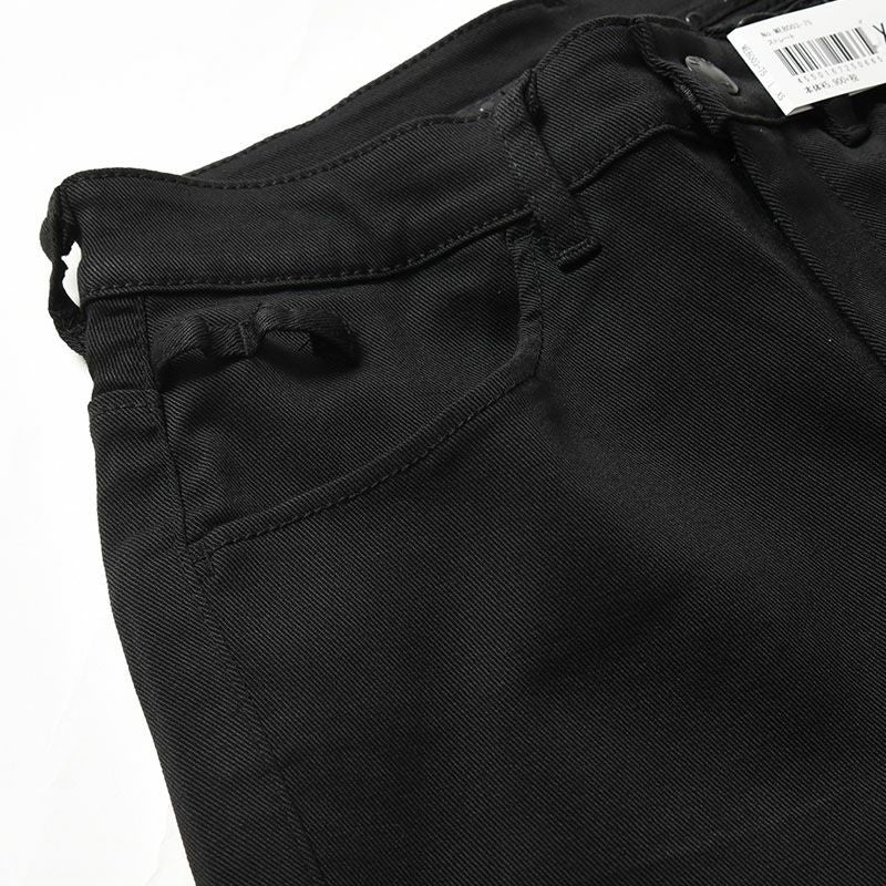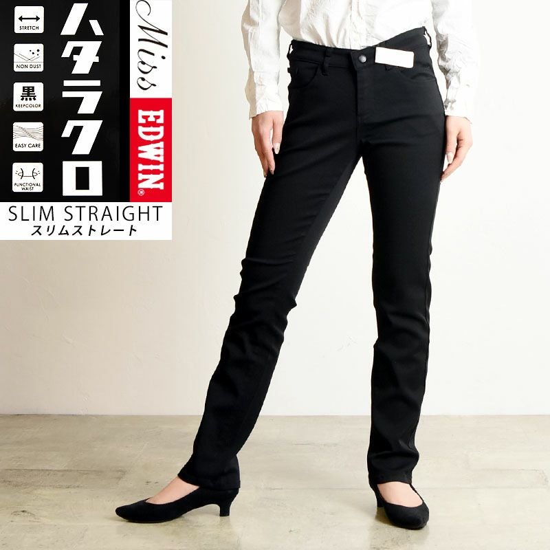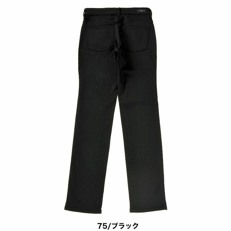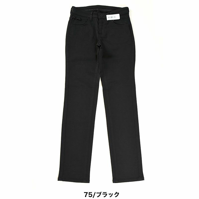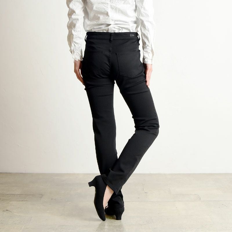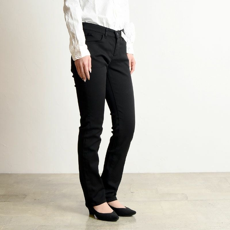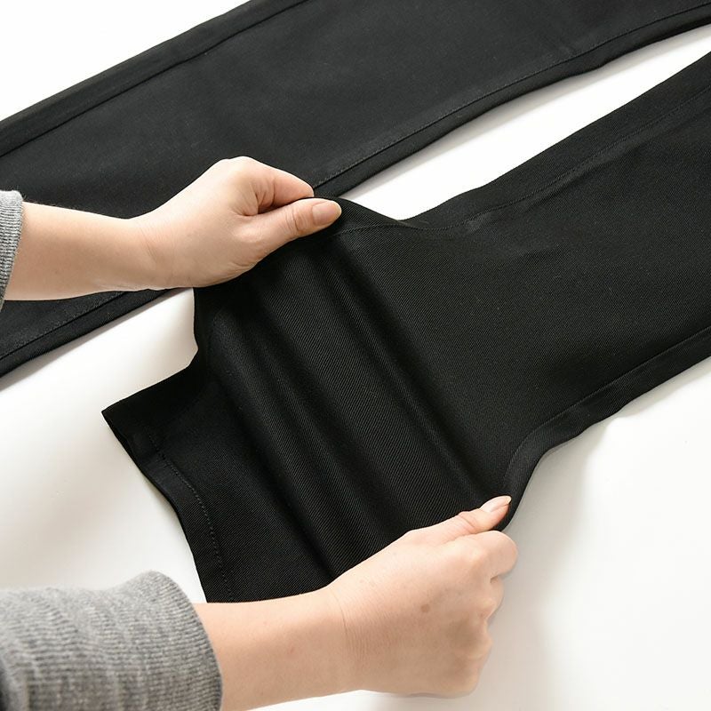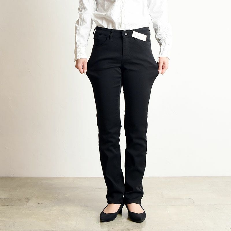 仕事用としても穿ける黒パンツは「ほこりが付くと目立つ」「毎日穿いているとすぐ色が褪せてしまう」という悩みを解決してくれるパンツです。ストレッチ性が高く、しっかりした綿タッチ素材です。ポリエステルとレーヨン混紡原着糸を使っているためホコリがつきにくく、色褪せしにくい素材です。シルエットは裾をやや細くしたストレートシルエット。通常のストレートよりもスッキリし見える万能シルエットです。フロントはスナップボタン開閉なので爪にも優しくて楽に着用でき、ウエストの内側には滑り止め加工がされているので、しゃがんだりしてもトップスがズレにくくなっていたりと、女性に嬉しいきめ細やかな配慮がされています。
