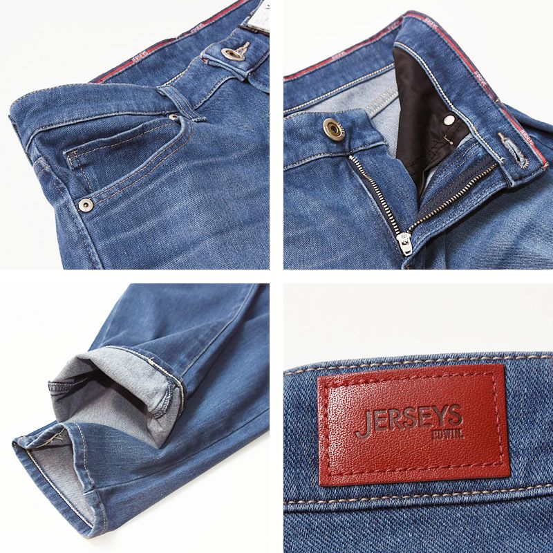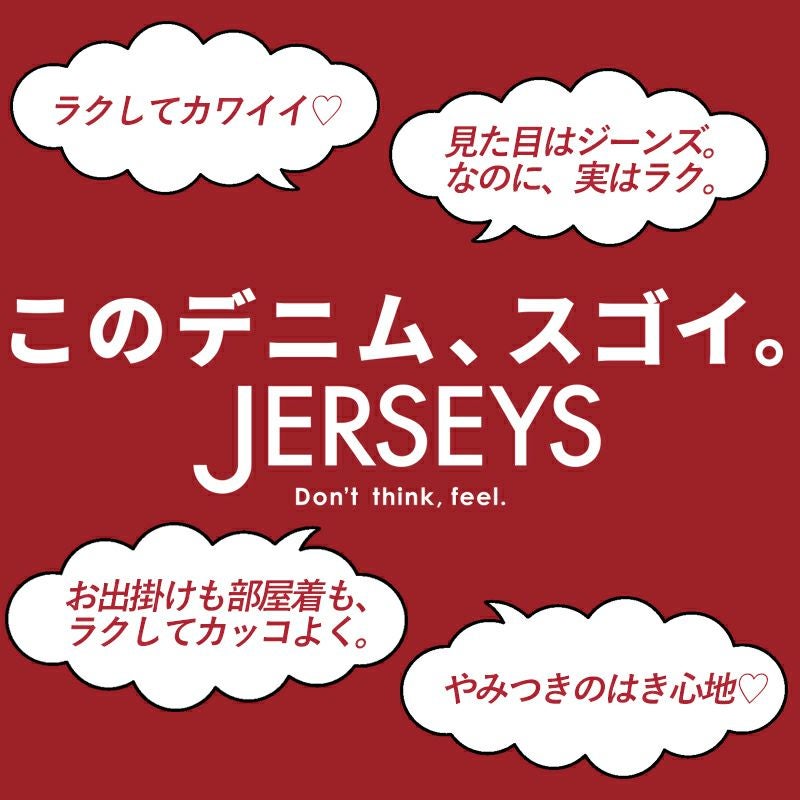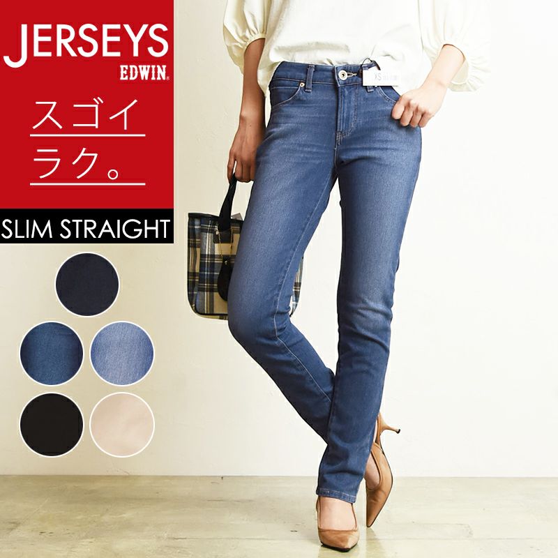 EDWIN(エドウィン)人気のJERSEYS(ジャージーズ)が、より手に取りやすい価格で新登場。見た目はまるで本格的なデニム。でも実はニット素材。新開発のハイパワーニットデニムを採用しています。脅威の回復力でずっと穿いてもヒザ抜けしにくい、型崩れしにくい特徴があります。穿いている感じがしない、『スゴイラク』な着用感。ウエストベルトにストレッチ性の芯地を使用し、『伸びるウエスト』に進化しました。お腹周りもストレスフリーに過ごしていただけます。さらに、穿きやすさと横から見た時の、美しさを両立させました。デニムの加工はレーザー加工をメインに、1本1本職人が丁寧に手擦りを施しています。デザインやディテールは、本来のEDWINらしさを追求し、女性がより美しく見える様に改善しました。後ろポケットの大きさやバランスにもこだわり、気になるヒップをコンパクトに見せ、すっきりとカバーしてくれます。シルエットは実績のスリムストレートを踏襲。腰回りから膝にかけては体にフィット、ひざから下は直線的なラインをとることにより、ふくらはぎの丸みをカバー。ひざ下が細く長く見えるようにこだわりました。