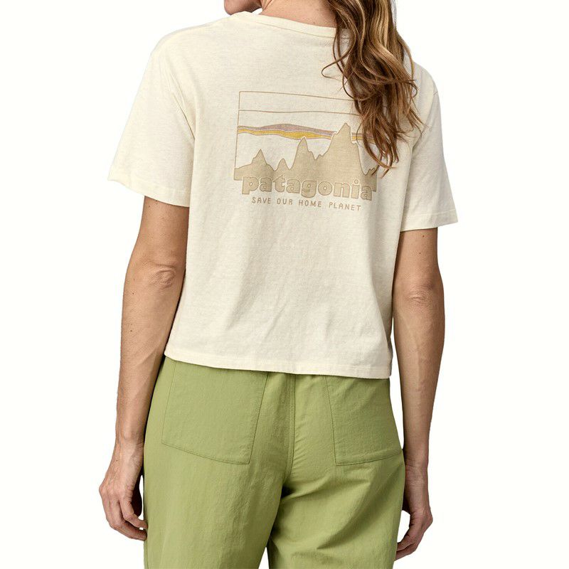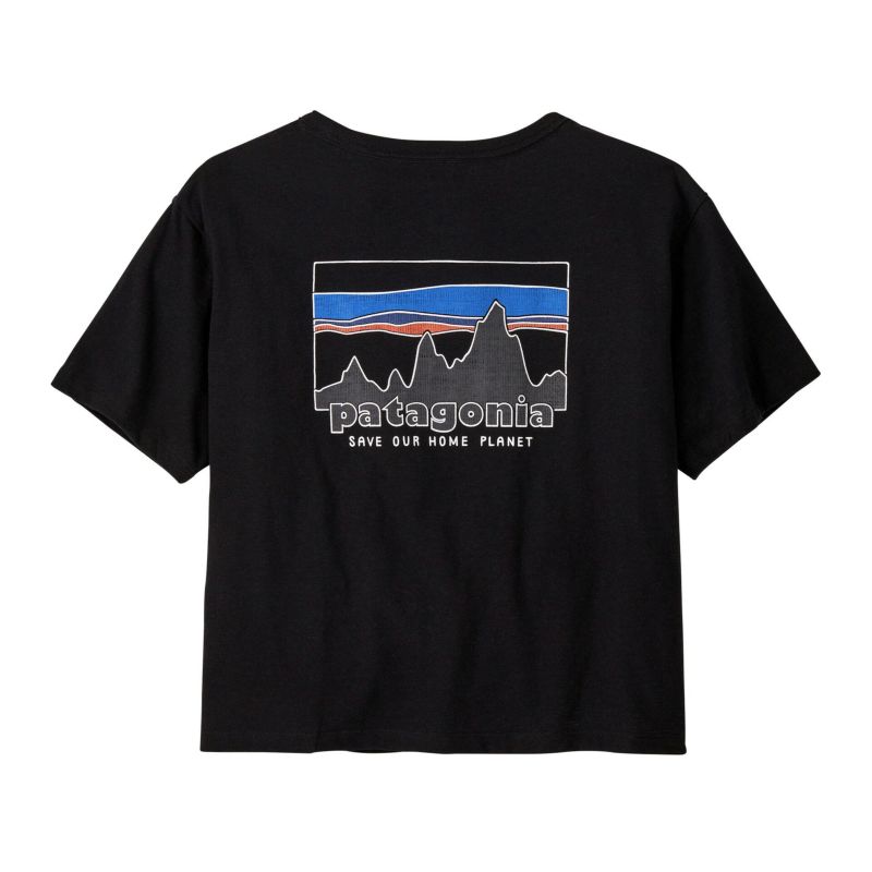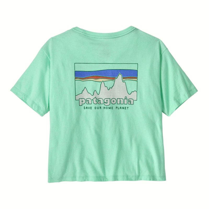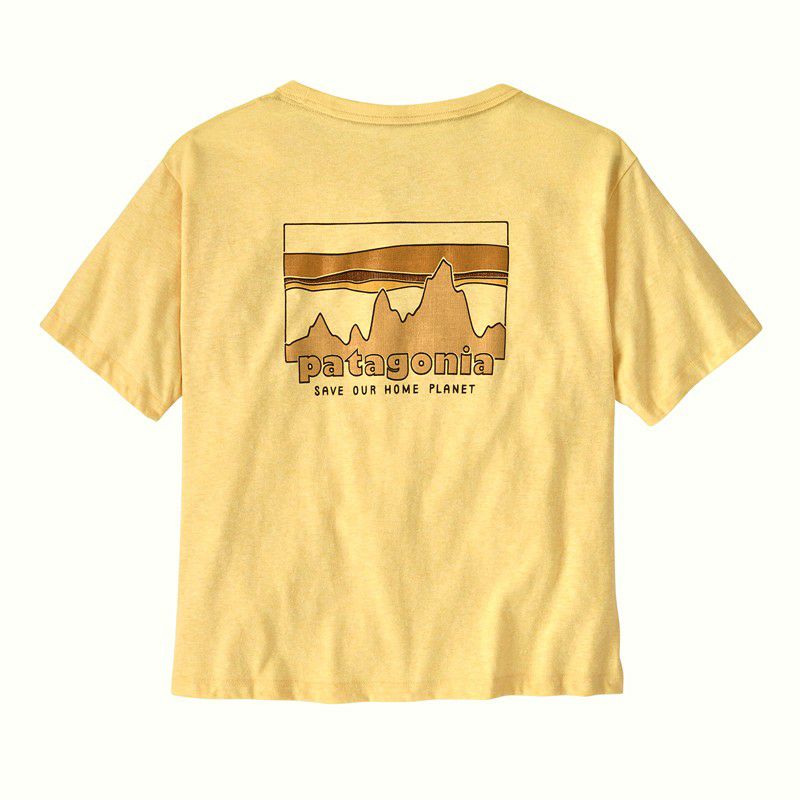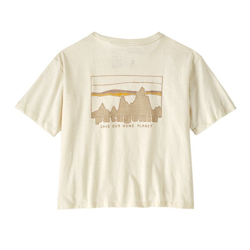 フロントはシンプルに左胸のワンポイントロゴ。バックにはクラシカルな印象漂うパタゴニアのロゴプリントが施されています。