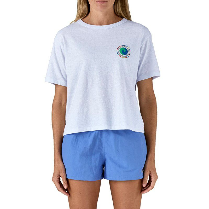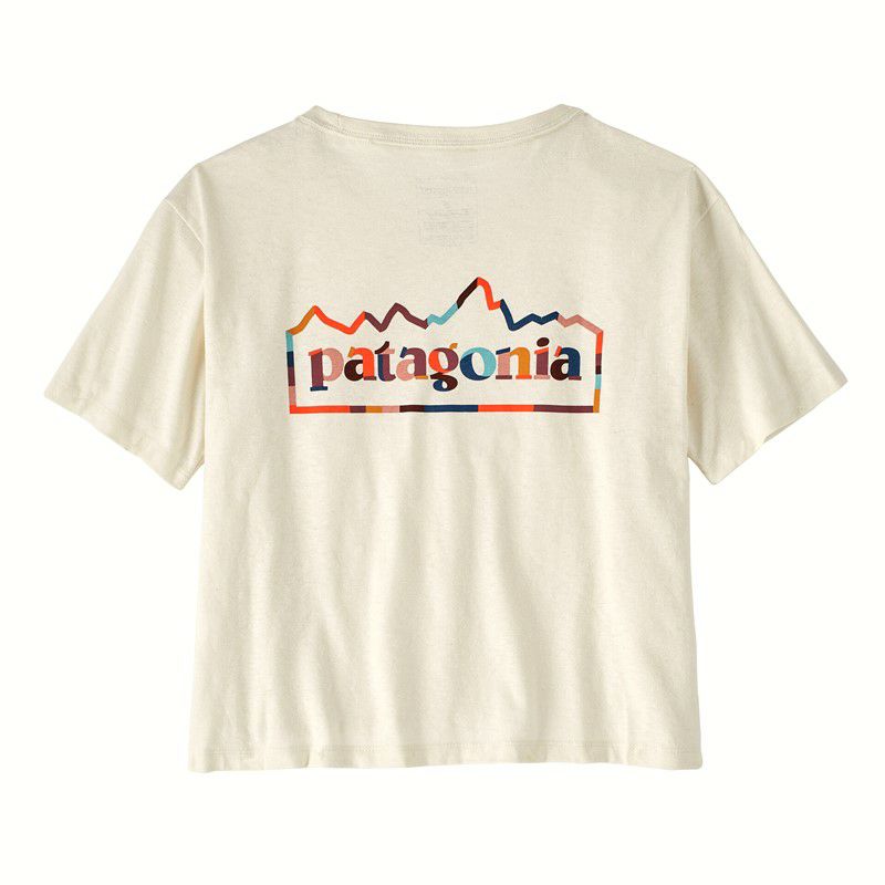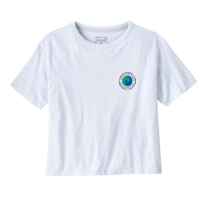 様式化した地球と「私たち全員が当事者である」というメッセージに加え、パタゴニアが目的とする「故郷である地球を救う」という文言がプリントされた、ユーティリティ・フィッツのTシャツ。