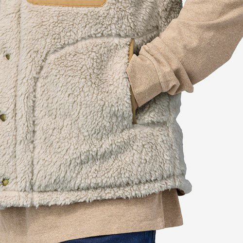 スナップボタン仕様で、ちょっとしたアクセントに。ボアベストとして着ると、レトロエックスシリーズの胸ポケットデザインと同様、パターン切り返しになっており、ジップ付きのポケットが施されているためさり気ないアクセントになります。