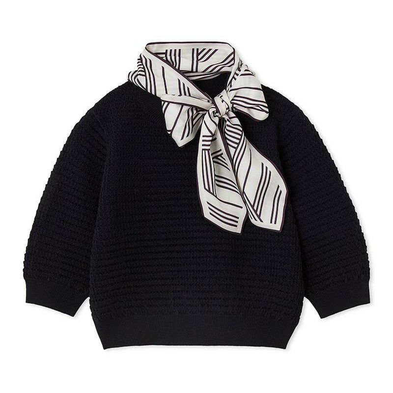 【タイスカーフ付きシンプルニットプルオーバーでスタイリングをアップデート】