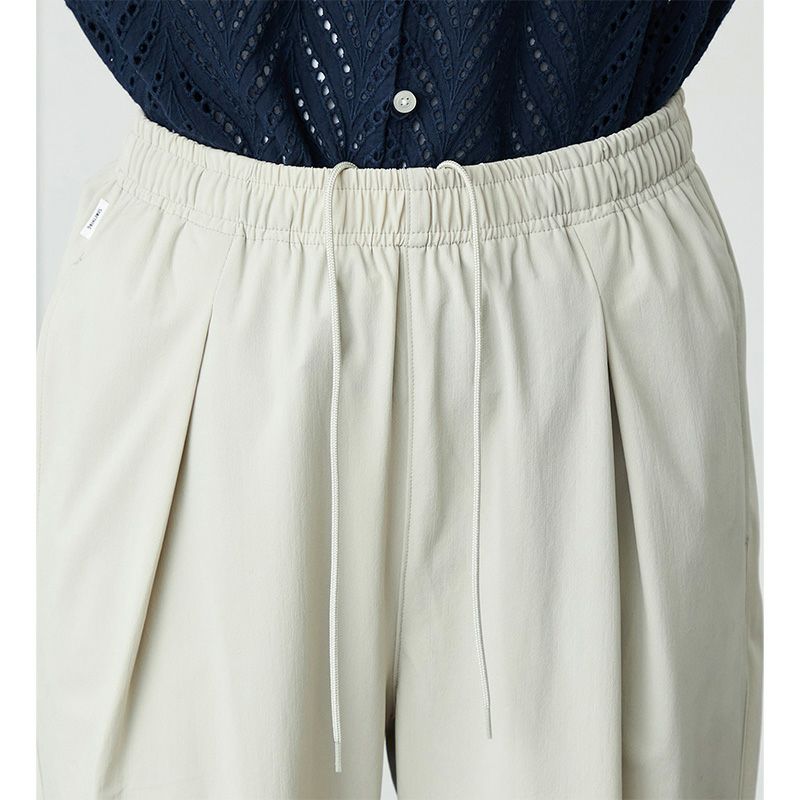 ウエスト部分に施したタックと、裾に向かって緩やかに曲線を描いたテーパードシルエットが、キレイめにもカジュアルにもマッチします。