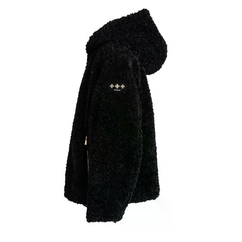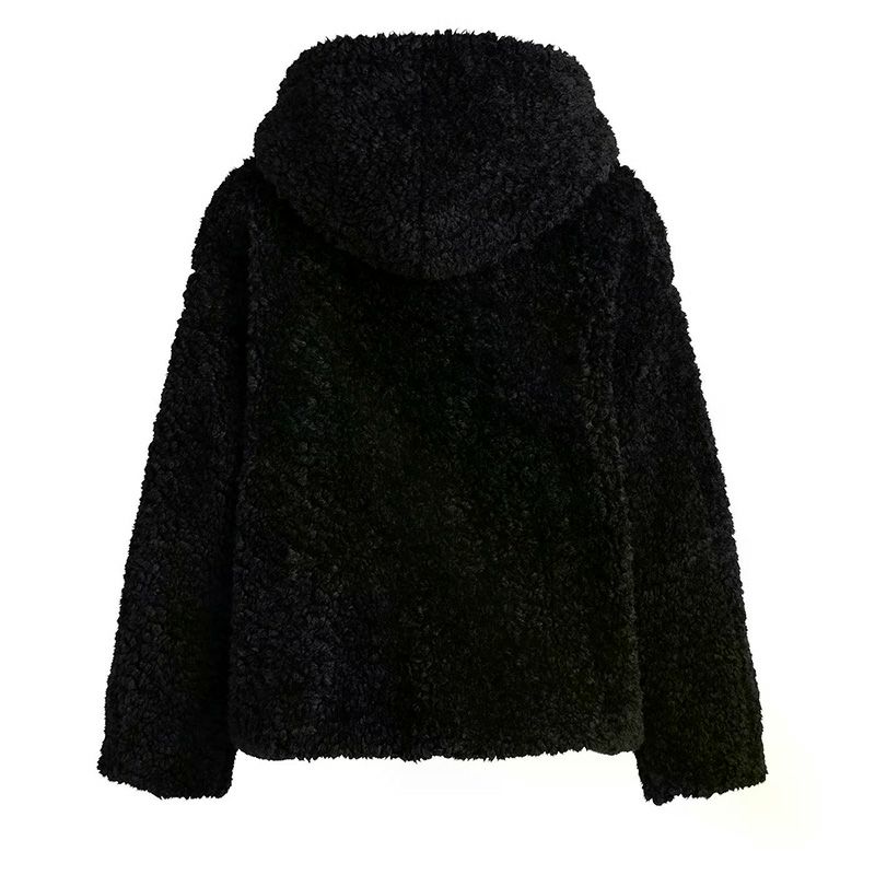 ポリエステル糸でウールライクな質感を実現させた、シープ調ボアのフード付きブルゾン。