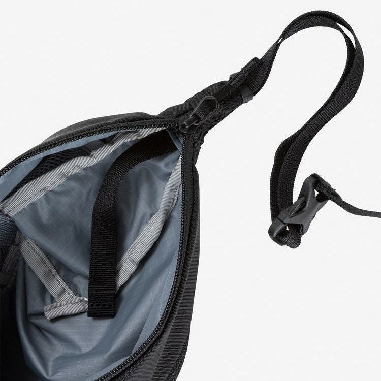 メインファブリックには、リサイクルナイロンを採用して環境に配慮。体に寄り添うデザインと、本体内部に収納できるショルダーベルトのテープエンド仕様は、見た目にもスマートなアイテムです。