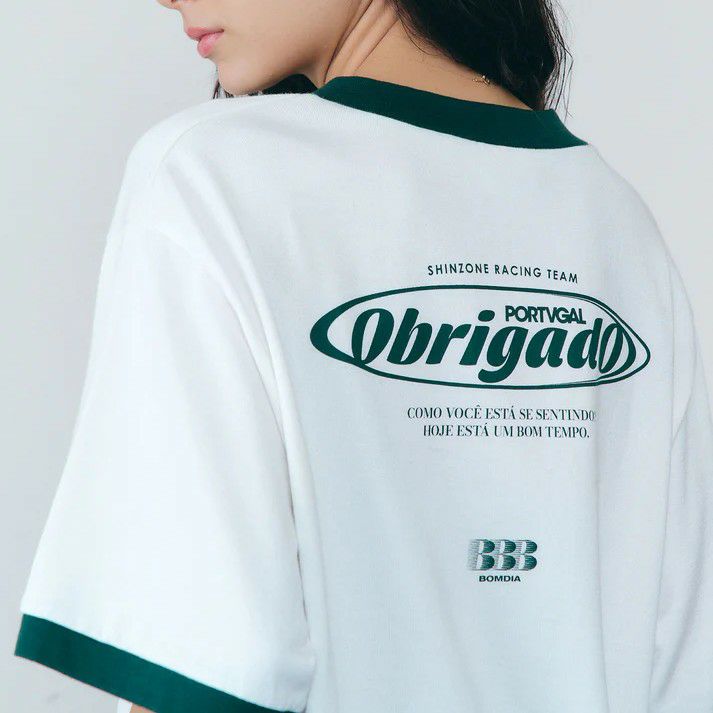少し光沢のあるヴィンテージ感の素材は、レーヨンとコットンのプレーティング天竺で、表側にレーヨンを使用しているため光沢があり、裏側はコットンでナチュラルな肌触りを実現しています。柔らかなレーヨンコットンがしなやかなドレープと心地よい肌触りを演出し、フットボールのユニフォームに使われる生地を模して作られています。ポルトガル語の挨拶がグラフィックに加わり、遊び心を感じさせるデザインです。