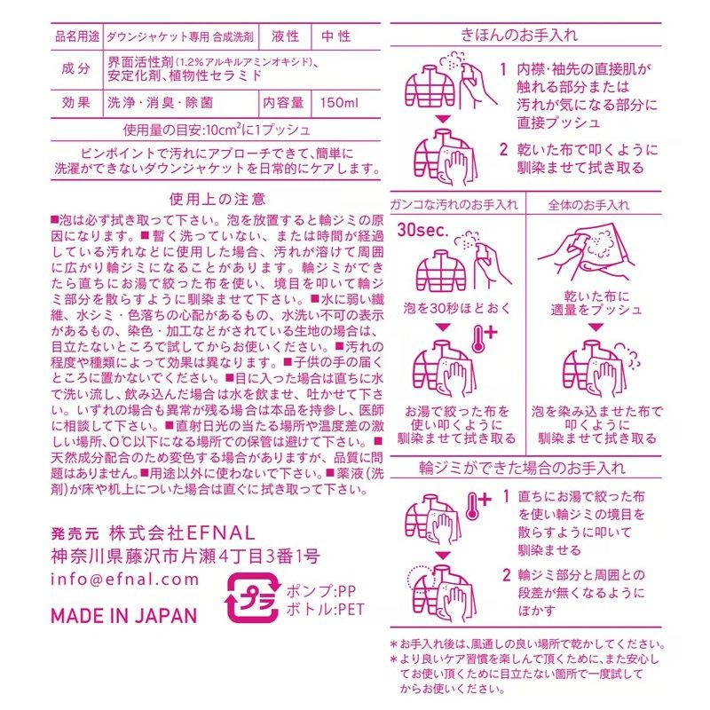 他の画像を見る ダウンジャケットのケアは水いらずのコレ1本! 【EFNAL/イフナル】EFNAL care(DOWN用)・EFCR001 販売価格 ¥ 3,300 税込 カートに入れる お気に入りに登録する