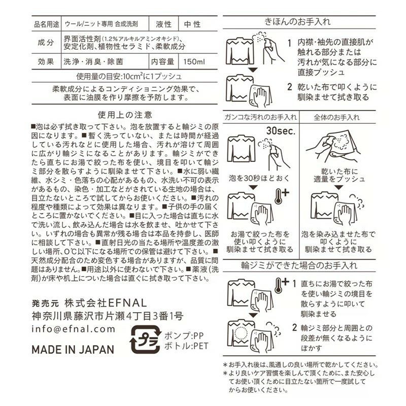 他の画像を見る ウールのコート・ニットのお手入れが、これ1本で解決!? 【EFNAL/イフナルケア】EFNAL care (WOOL用)・EFCR002 販売価格 ¥ 3,300 税込 カートに入れる お気に入りに登録する