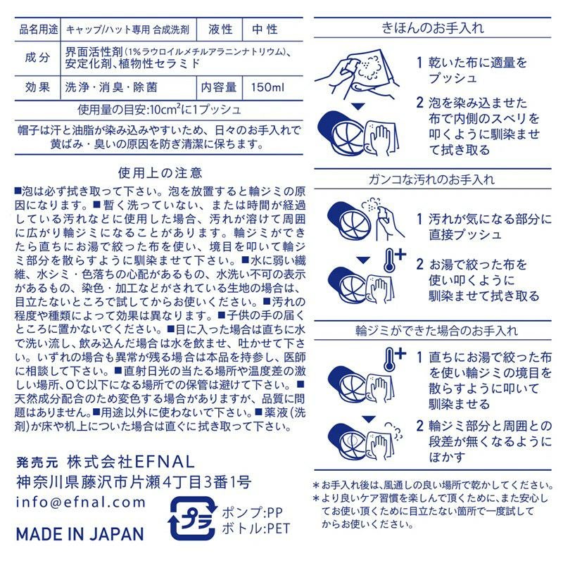 他の画像を見る 汗で黄ばんだキャップ、見えない汗・皮脂汚れも、これ1本! 【EFNAL/イフナルケア】EFNAL care(CAP用)・EFCR003 販売価格 ¥ 3,300 税込 カートに入れる お気に入りに登録する