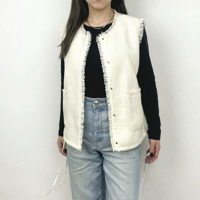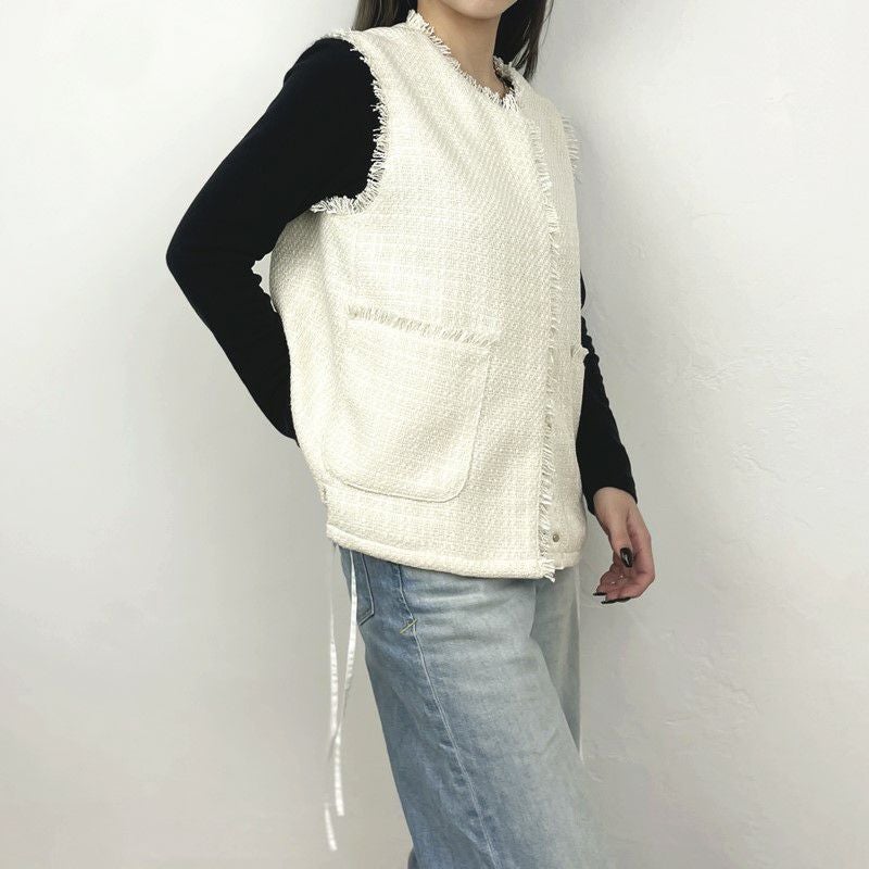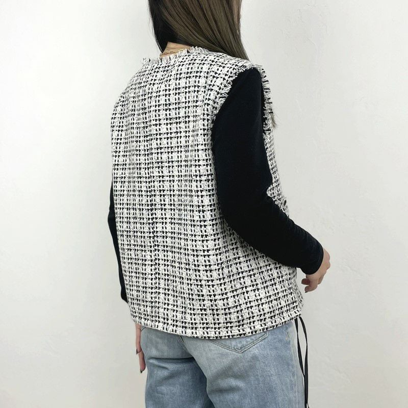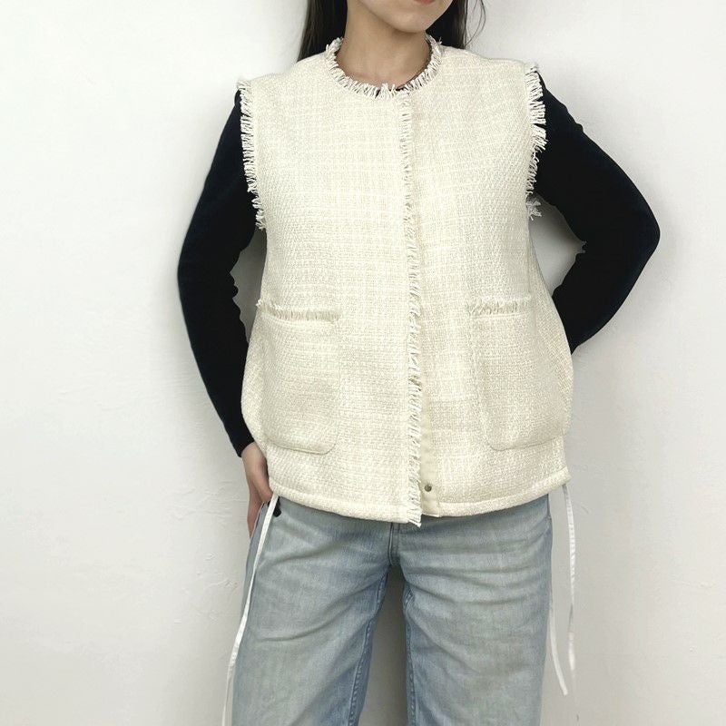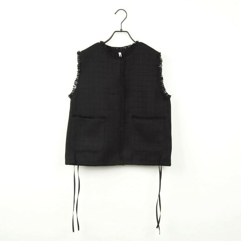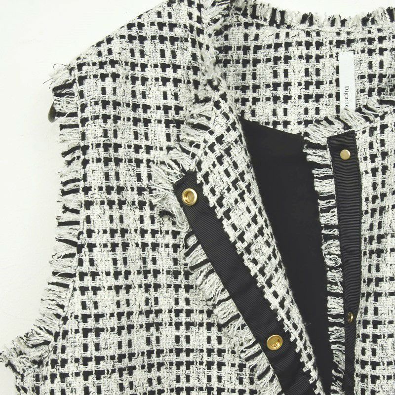 他の画像を見る WHT BLK サイドのリボンで裾を絞れるコンパクトツィードベスト 【Dignite collier/ディニテコリエ】ツィードジレ・80254041 販売価格 ¥ 17,600 税込 カートに入れる お気に入りに登録する