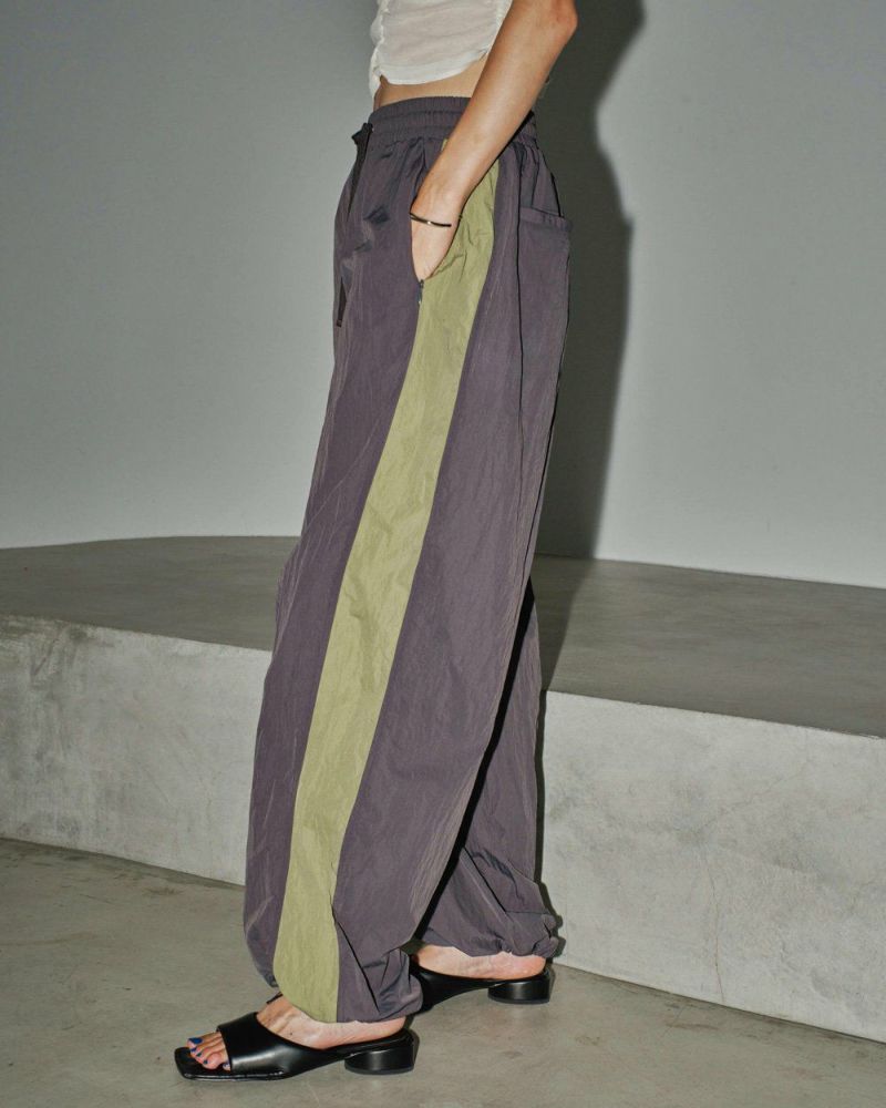 ワイドなシルエットと、スタイリングのアクセントになる配色のサイドラインがポイント。