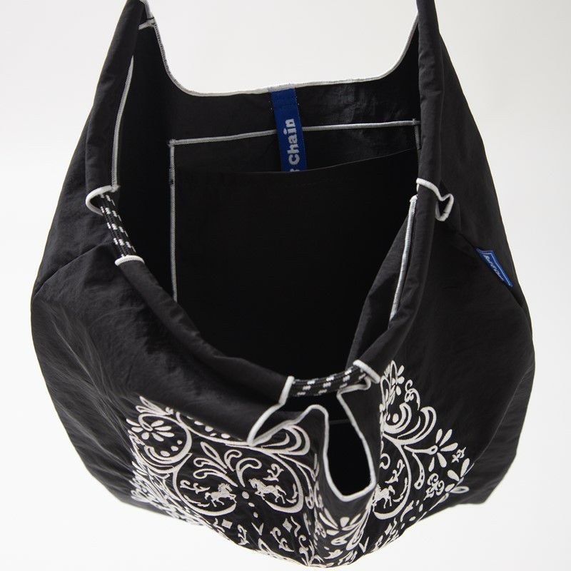 Ball and Chainは大切に使い続けたいと思える優れた デザインのショッピングバッグです。 耐久性、撥水性に優れた厚手のポリエステル素材に、 グラフィックデザインをそのまま「刺繍」で施すことで、 高級感がありデザイン性の高いバッグとなっています。 丸く折りたたみ付属のゴムバンドでとめると手のひらほどの コンパクトサイズになるため、持ち運びにも便利です。 普段のお買い物はもちろん、エコなプレゼントとしてもおススメです。