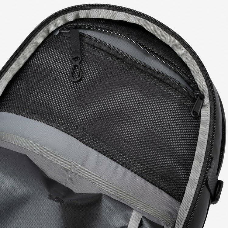 メインコンパートメントは、大きく開閉するパネルローディングタイプ。15インチまでのノート型PC専用スリーブとハイドレーション用のスリーブポケット付き。メイン生地と補強生地の両方にリサイクル素材を採用し、環境保護へも配慮しています。