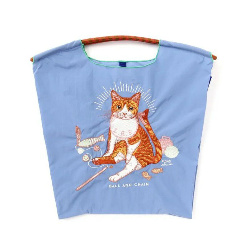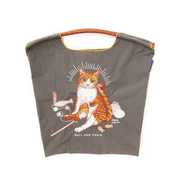 耐久性、撥水性に優れた厚手のポリエステル素材に、グラフィックデザインをそのまま「刺繍」で施すことで高級感があり、デザイン性の高いバッグとなっております。丸く折りたたみ内側に付属のバンドで止めるとよりコンパクトに。収納に困らず、持ち運びにも便利です。
