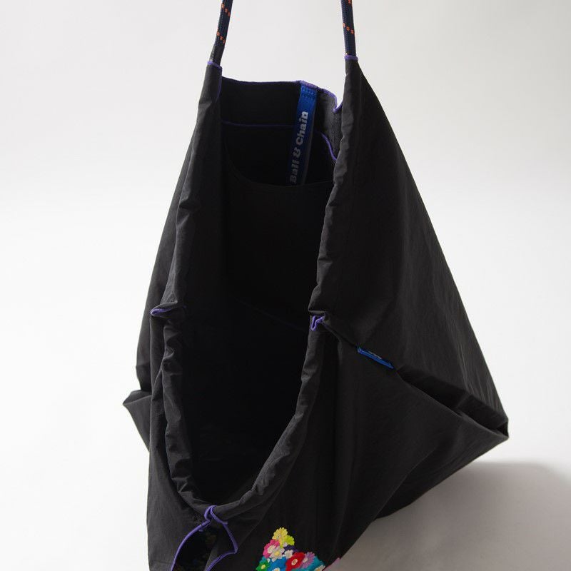 Ball and Chainは大切に使い続けたいと思える優れた デザインのショッピングバッグです。 耐久性、撥水性に優れた厚手のポリエステル素材に、 グラフィックデザインをそのまま「刺繍」で施すことで、 高級感がありデザイン性の高いバッグとなっています。 丸く折りたたみ付属のゴムバンドでとめると手のひらほどの コンパクトサイズになるため、持ち運びにも便利です。 普段のお買い物はもちろん、エコなプレゼントとしてもおススメです。