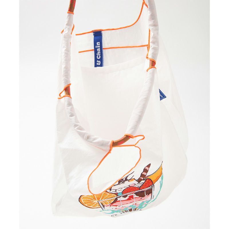 Ball and Chainは大切に使い続けたいと思える優れた デザインのショッピングバッグです。 耐久性、撥水性に優れた厚手のポリエステル素材に、 グラフィックデザインをそのまま「刺繍」で施すことで、 高級感がありデザイン性の高いバッグとなっています。 丸く折りたたみ付属のゴムバンドでとめると手のひらほどの コンパクトサイズになるため、持ち運びにも便利です。 普段のお買い物はもちろん、エコなプレゼントとしてもおススメです。