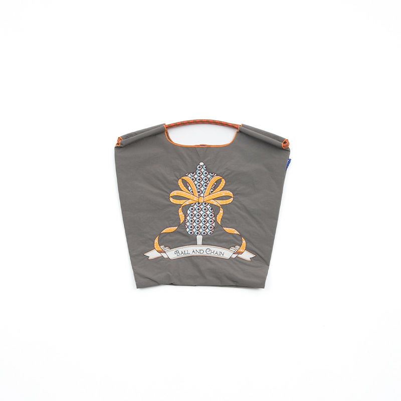 Ball and Chainは大切に使い続けたいと思える優れた デザインのショッピングバッグです。 耐久性、撥水性に優れた厚手のポリエステル素材に、 グラフィックデザインをそのまま「刺繍」で施すことで、 高級感がありデザイン性の高いバッグとなっています。 丸く折りたたみ付属のゴムバンドでとめると手のひらほどの コンパクトサイズになるため、持ち運びにも便利です。 普段のお買い物はもちろん、エコなプレゼントとしてもおススメです。