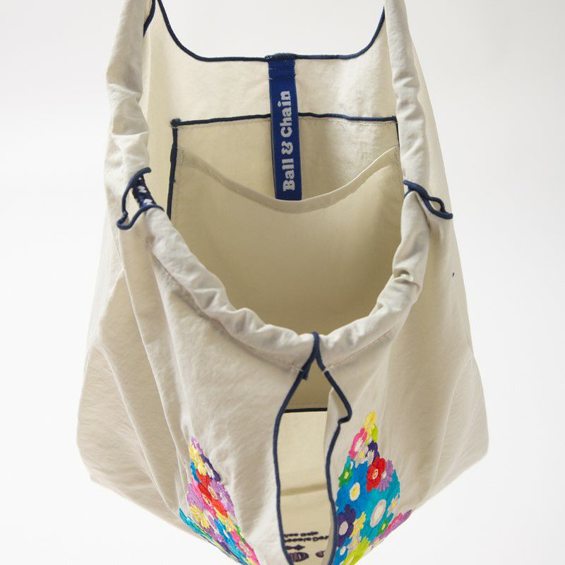 Ball and Chainは大切に使い続けたいと思える優れた デザインのショッピングバッグです。 耐久性、撥水性に優れた厚手のポリエステル素材に、 グラフィックデザインをそのまま「刺繍」で施すことで、 高級感がありデザイン性の高いバッグとなっています。 丸く折りたたみ付属のゴムバンドでとめると手のひらほどの コンパクトサイズになるため、持ち運びにも便利です。 普段のお買い物はもちろん、エコなプレゼントとしてもおススメです。