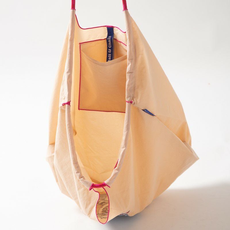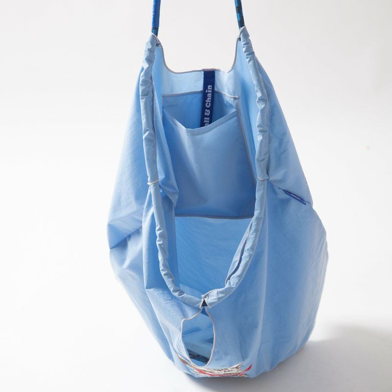 Ball and Chainは大切に使い続けたいと思える優れた デザインのショッピングバッグです。 耐久性、撥水性に優れた厚手のポリエステル素材に、 グラフィックデザインをそのまま「刺繍」で施すことで、 高級感がありデザイン性の高いバッグとなっています。 丸く折りたたみ付属のゴムバンドでとめると手のひらほどの コンパクトサイズになるため、持ち運びにも便利です。 普段のお買い物はもちろん、エコなプレゼントとしてもおススメです。