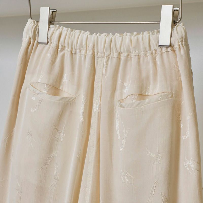 国内で織り上げたオリジナルジャガード生地を使用したパンツ。丁寧に織り込まれた生地は風合いがよく、ヴィンテージのようなツバメ柄が目をひく一本。ウエストは紐で調整可能なイージー仕様。剥ぎ目の部分にコバステッチを施し、ウエストにふんだんに入れたギャザーとタックがポイントです。同じ生地を使用したSwallow Satin Pantsとセットアップで着るのもおすすめ。エクリュのみ裏地つき。