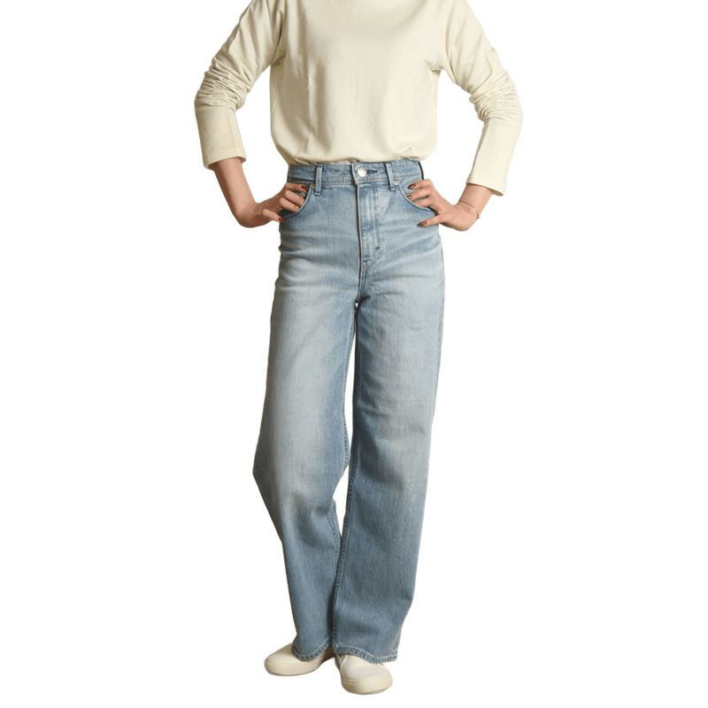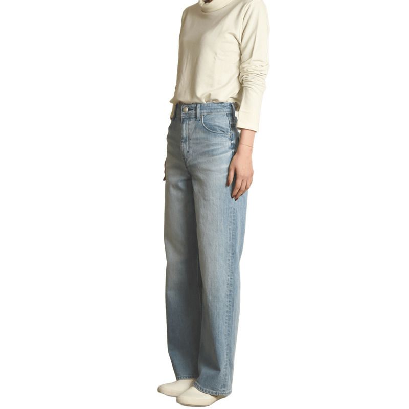 スカッとした爽やかさにこだわったクリアカラー。クリーンなUSED加工がポイントです。綺麗なサックスカラーと色落ち部分のホワイトとのコントラストが効いた爽快な人気色です。ステッチカラーが白に近いグレー色で、より爽やかな印象を引き立てます。ヒゲやスリがしっかり入っているので立体感があり、気になるお腹回りをカバーしてくれます。メリハリがあり、モモのハイライトが内側寄りに入っているので、脚がスッキリして見え、美脚見えが叶う万能な1本です。