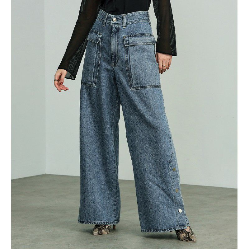 大きな四角いフロントポケットと、サイドスリットがデザインポイント。大きめなポケットが気になる腰周りをカバー。スソにかけてストンと落ちるすっきりシルエットで、モードな印象に仕上げた1本。