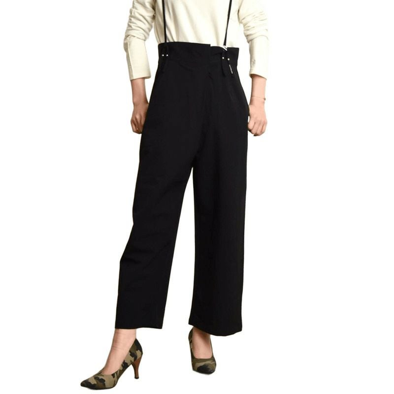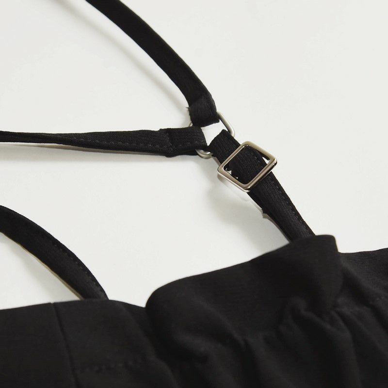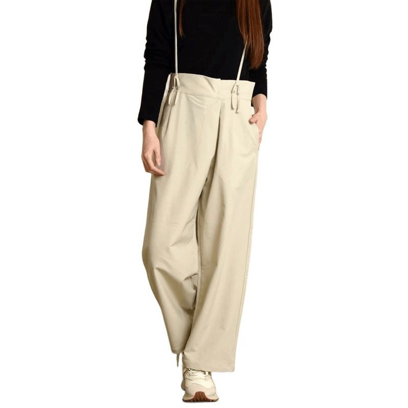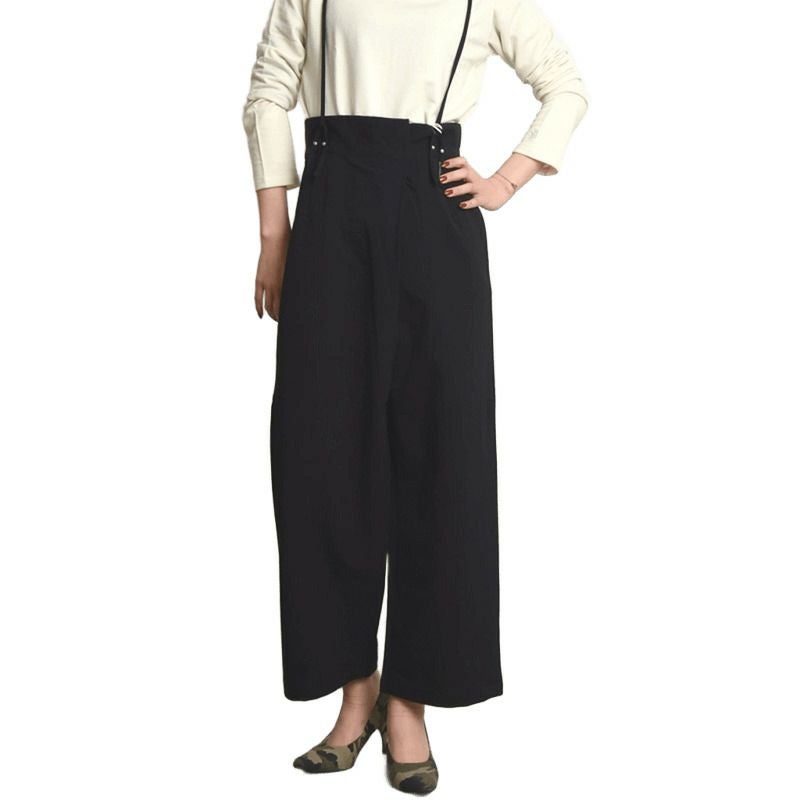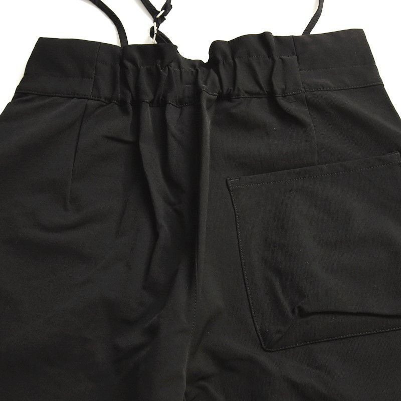 細めのサスペンダーストラップで華奢で女性らしい印象をプラス。ハイウエストデザインですが、ストレッチ素材と背面はゴム仕様のためスッキリ脚長効果◎