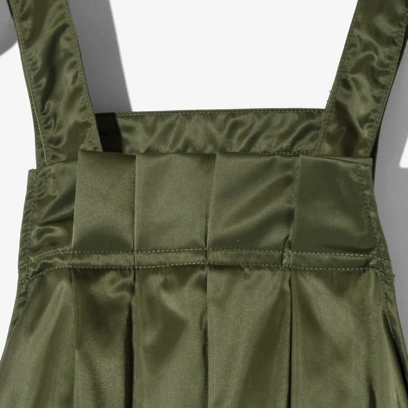 定番のジャンパースカート。ナイロン100%のツイル生地を採用し、フロントはナイフプリーツ(片ひだ)となっており、バックは大きく開いたフリルデザインで、フリル部分に搭載されたドローコードを引けば背中の開き方が調整できます。
