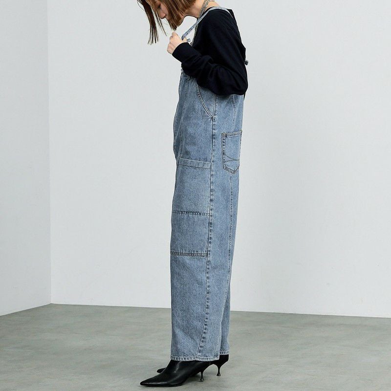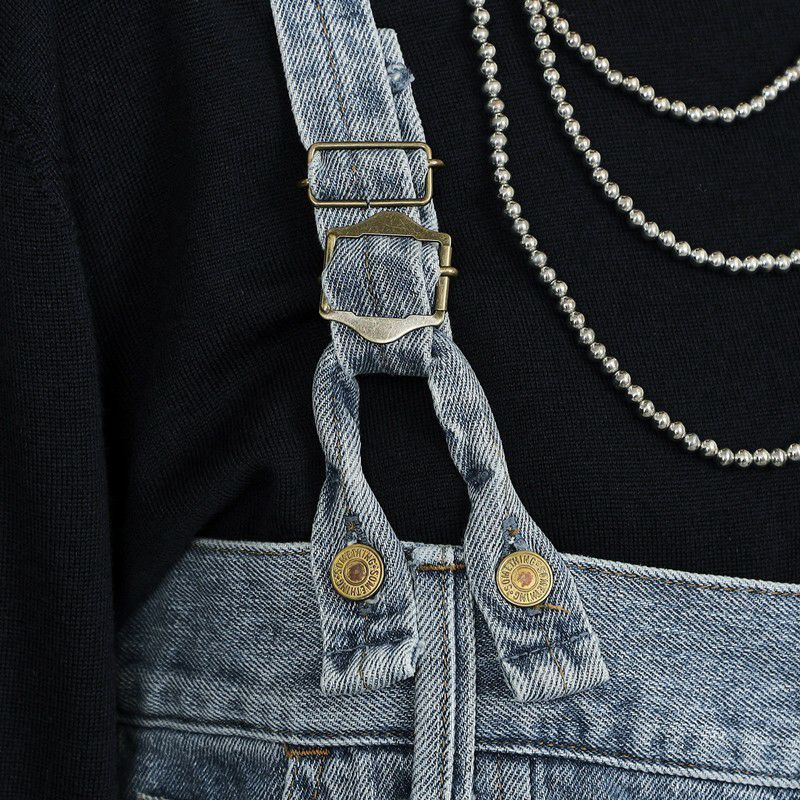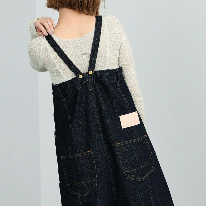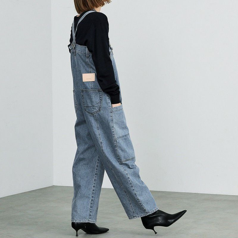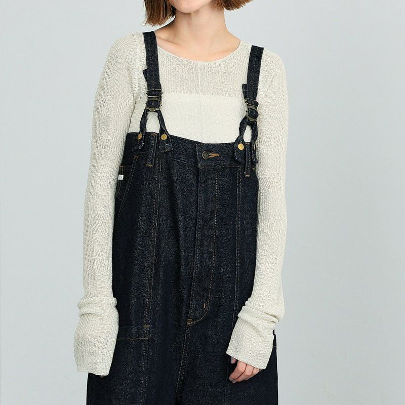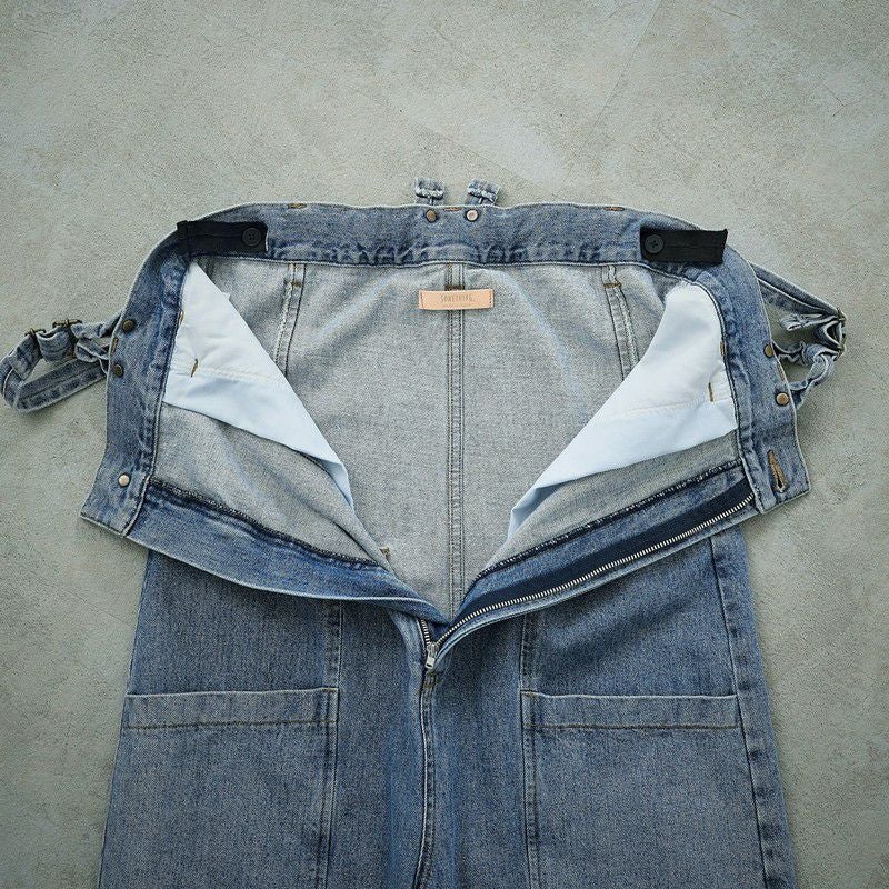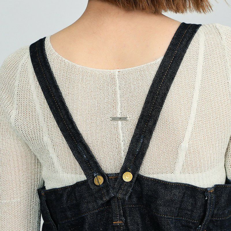 ダブルニーのデザインがポイントの3WAYサロペット。デニムの肩紐は取り外し可能。肩紐をとって、内側のゴムを調整すれば、ベアトップサロペットとしてもご着用いただけます。ボタンを付け替えればラップパンツとしても着用できる、着回し力抜群のアイテム。