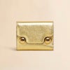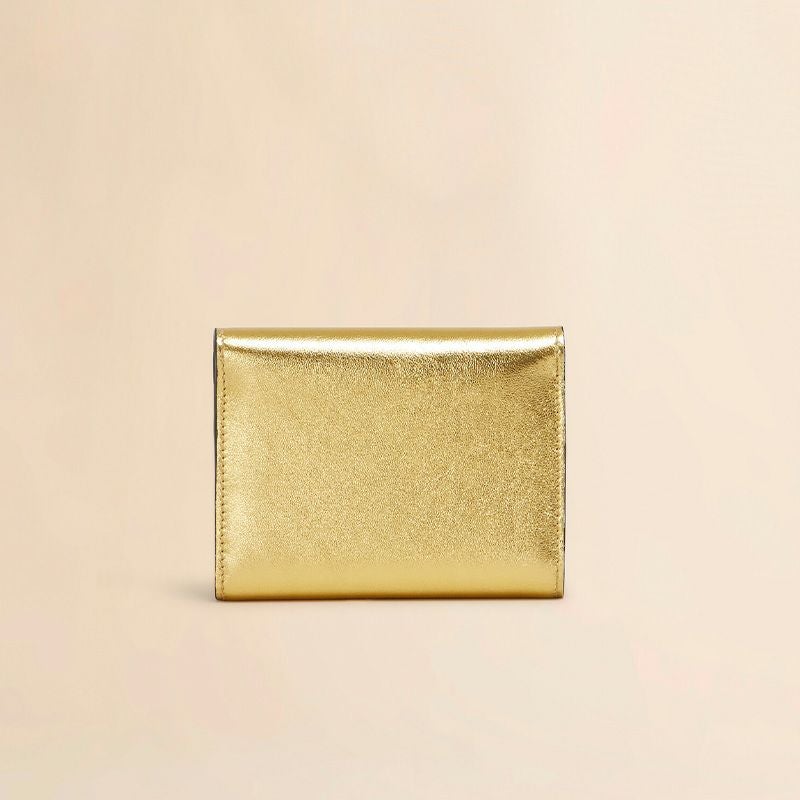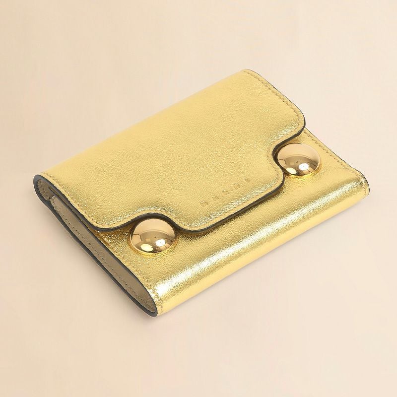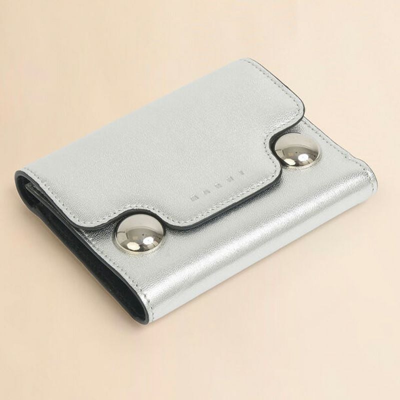 メタリックレザー製 Trunkaroo 三つ折りウォレット。 エンボス加工のマルニレターとオーバーサイズのスタッズディテール。 スナップボタン留め。 ファスナー式コインポケット、紙幣用コンパートメント、6つのカードスロット。