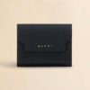 サフィアーノレザー製の三つ折りウォレット。モノクロームデザイン、スナップボタン開閉。内側に紙幣ポケットとカードスロット。フロントにゴールドトーンのロゴプリント。