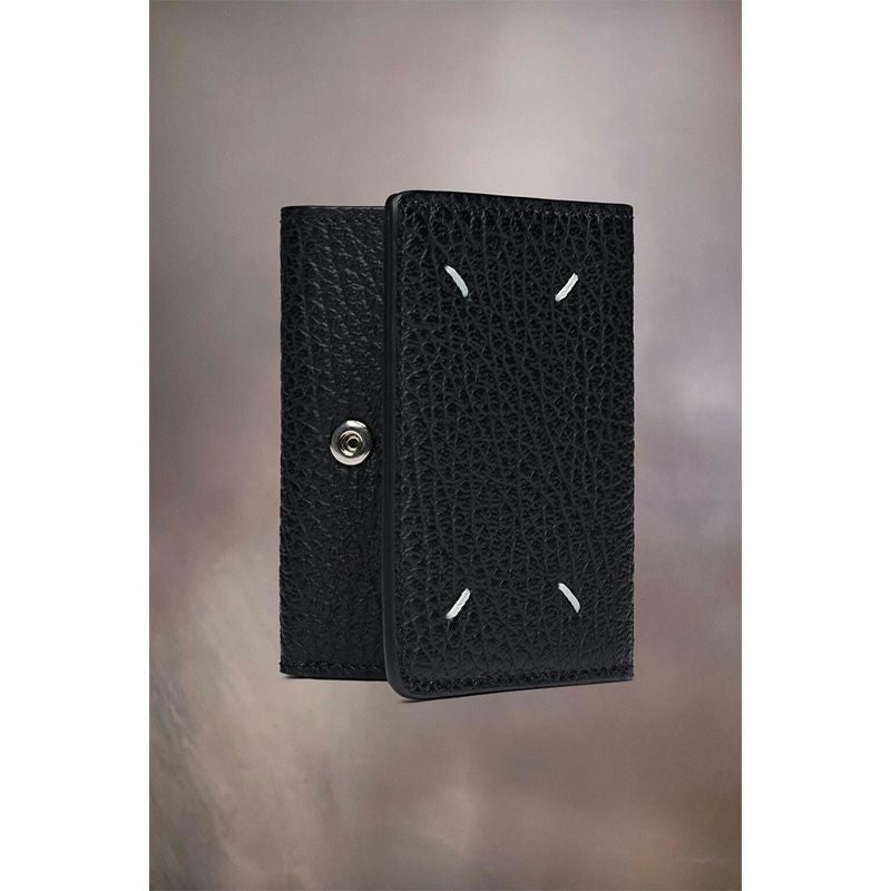 エンボス加工が施されたグレイニーレザー製のスリーフォールドウォレットです。エンベロープポケットとスナップボタンクロージャーが付いています。内側にはナンバリングロゴがあしらわれています。バックには、通常のファッションブランドのラベルとは対照的なメゾン マルジェラのシグネチャーの白い4ステッチがあしらわれています。